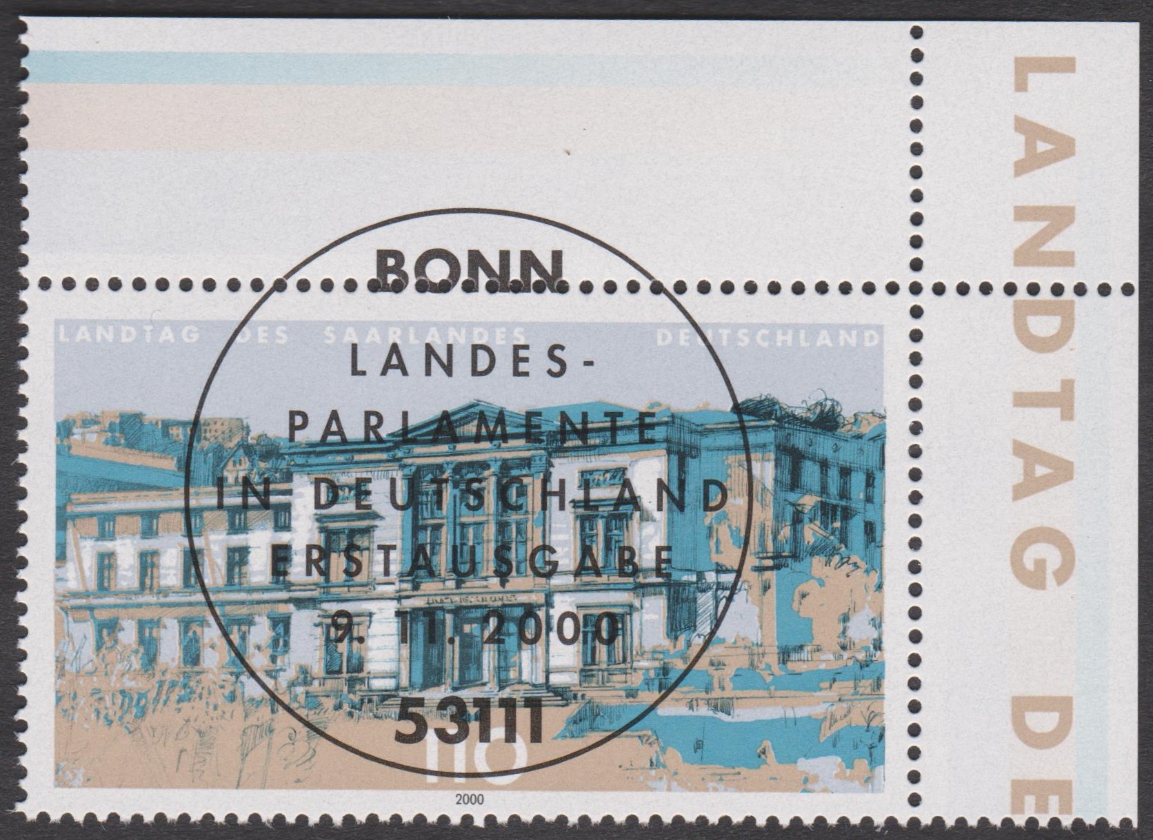 Bund MiNr. 2153, LANDTAG DES SAARLANDES, rechte obere Ecke des Zehnerbogens mit ESST BONN: