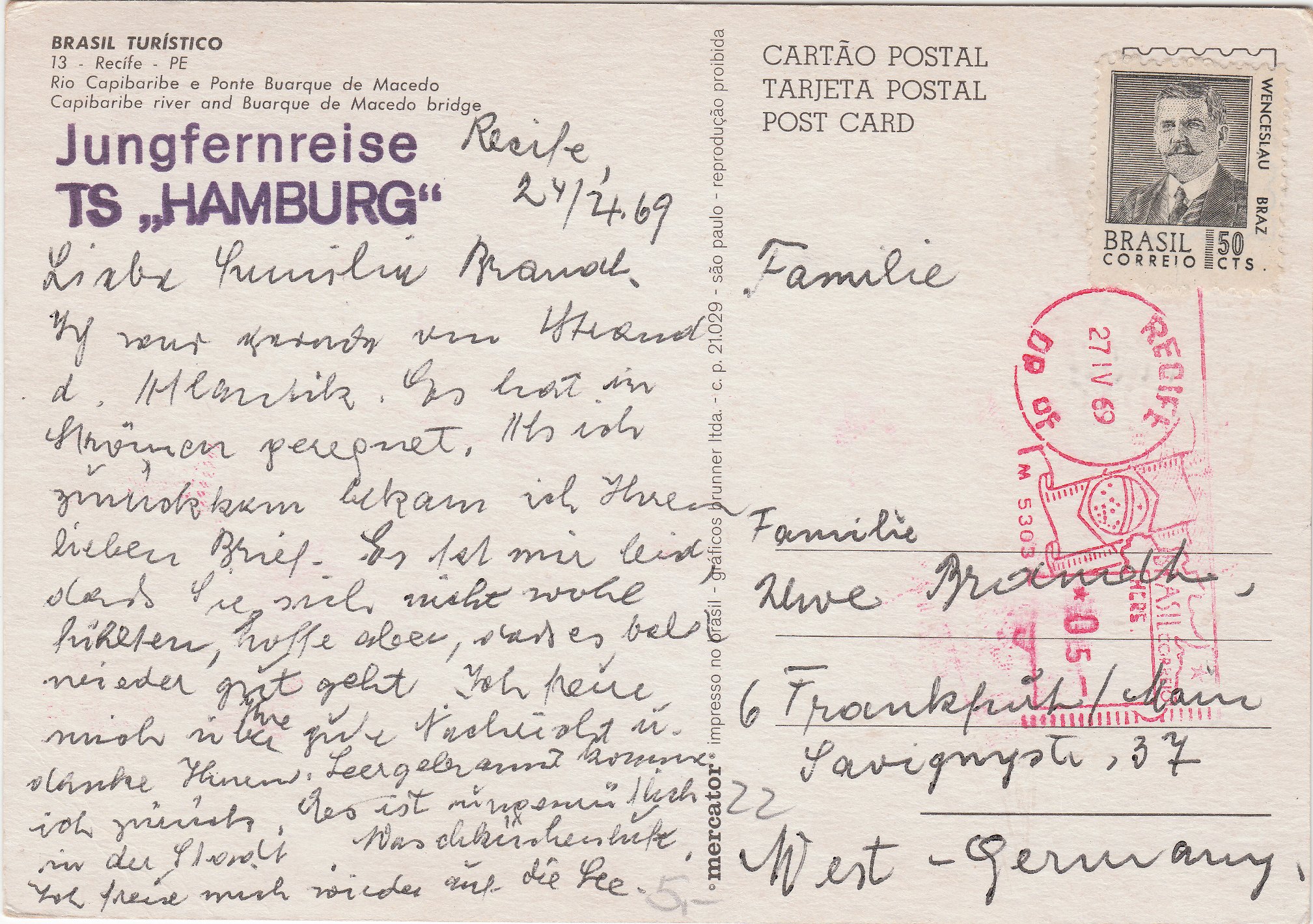 Diese Postkarte wurde während dieser Jungfernreise am 27.04.1969 in RECIFE in Brasilien aufgegeben: