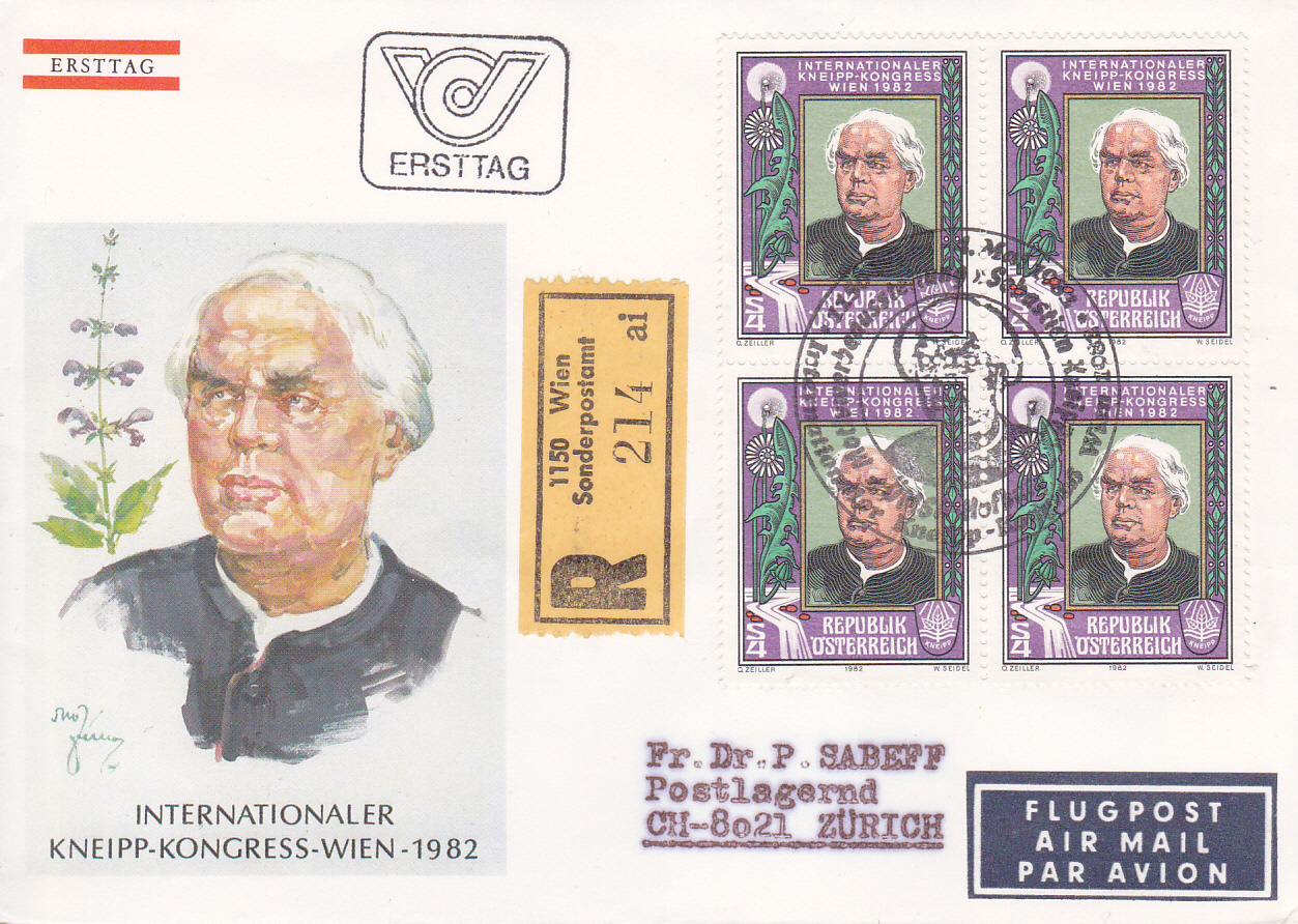 Gelaufener FDC von Wien nach Zürich mit einer Marke aus Österreich (MiNr 1700) zum Internationalen Kneipp-Kongress in Wien mit dem Porträt von Sebastian Kneipp. Auch im Ersttagsonderstempel wird ein Porträt von Kneipp gezeigt.