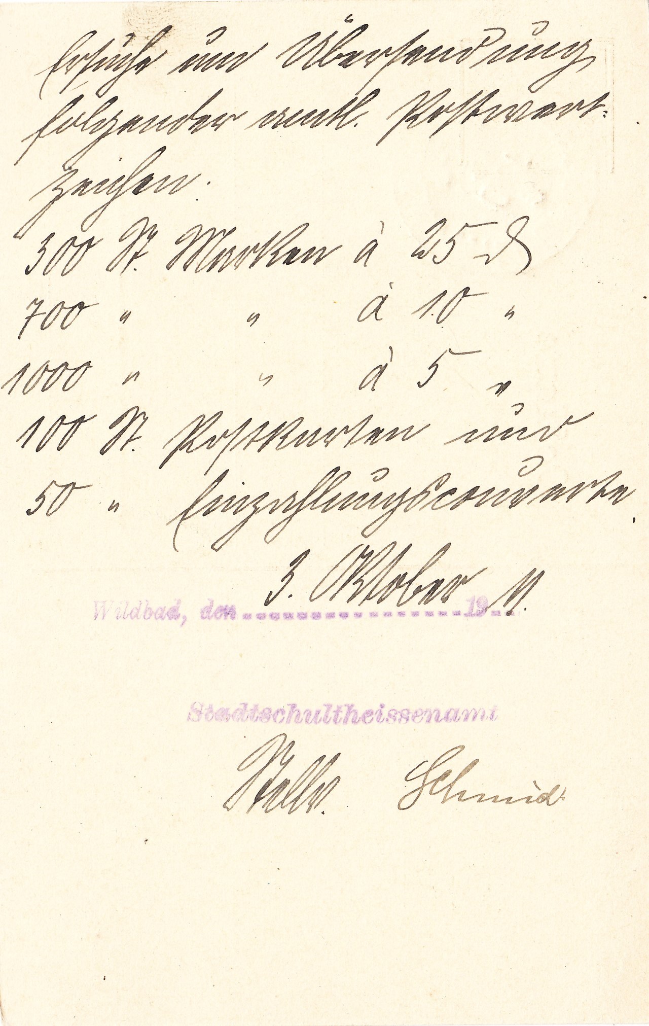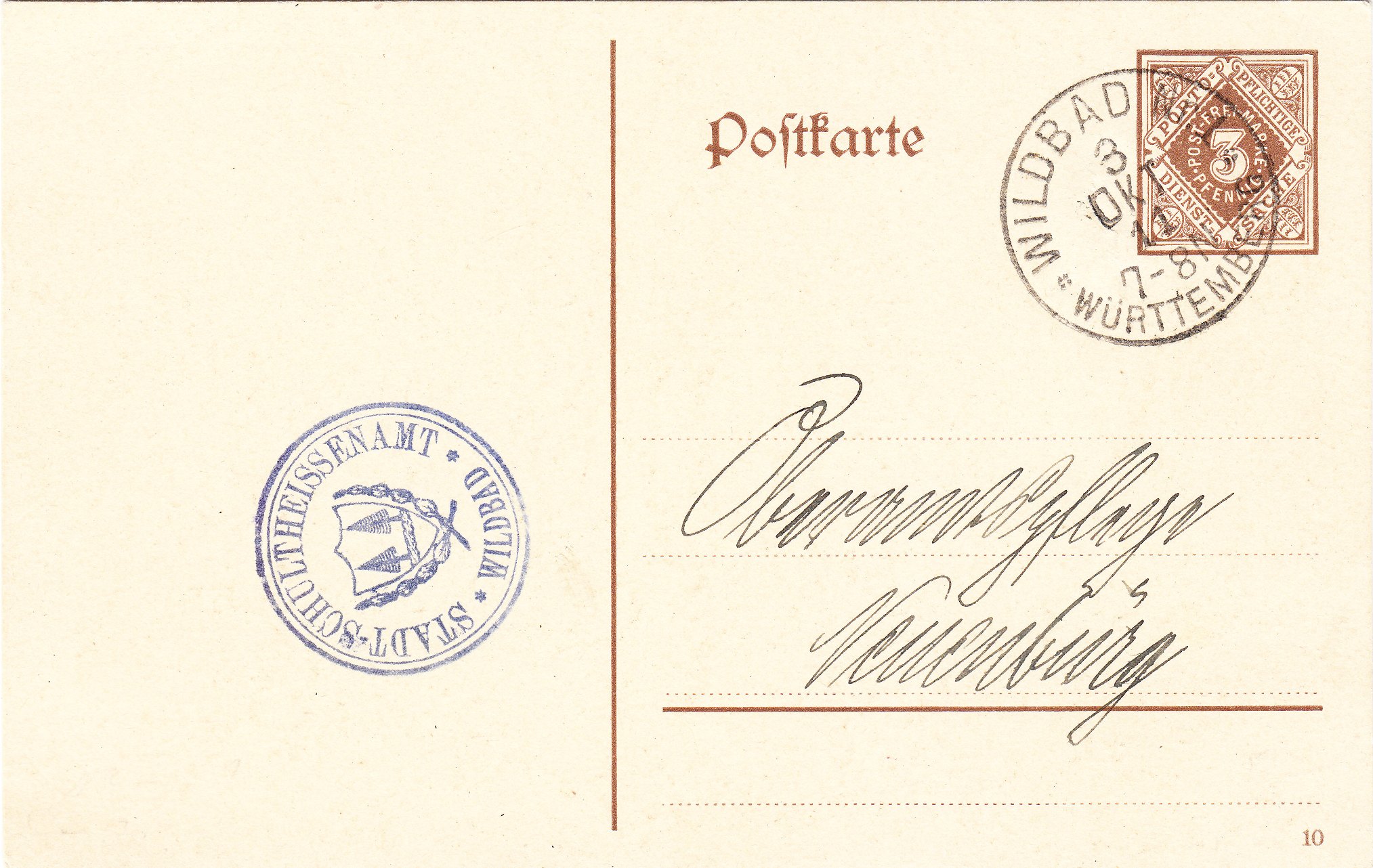 Dieses Exemplar wurde adressiert an "Oberamtspflege Neuenburg" am 03.10.1911 vom "STADT-SCHULTHEISSENAMT WILDBAD" gebraucht: