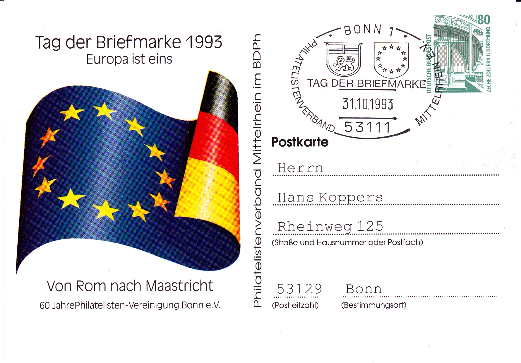 Der Tag der Briefmarke 1993 wurde in Deutschland am 31.10.1993 mit Veranstaltungen gefeiert. Das zentrale Thema lautete "Europa wird eins".