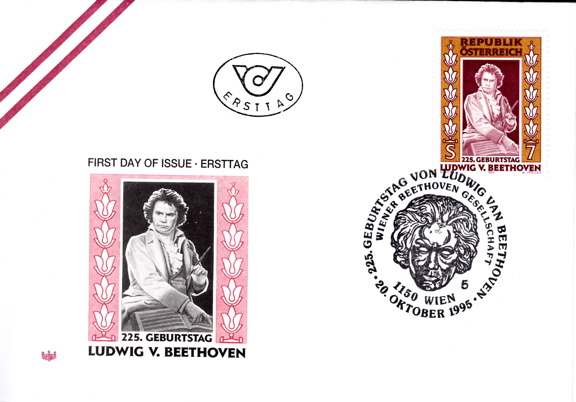 FDC mit der bereits gezeigten Marke aus Österreich zum 225. Geburtstag von Ludwig van Beethoven (MiNr 2175) und einem Sonderstempel aus Wien mit dem Kopf von Ludwig van Beethoven.