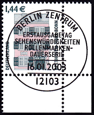 In der DS "Sehenswürdigkeiten" ist eine Marke zu 1,44€ (MiNr 2306) mit der Abbildung "Beethoven-Haus Bonn" erschienen. Es ist das Geburtshaus Beethovens in der Bonngasse Nr. 20. Hier zeige ich eine Marke vom Eckrand.