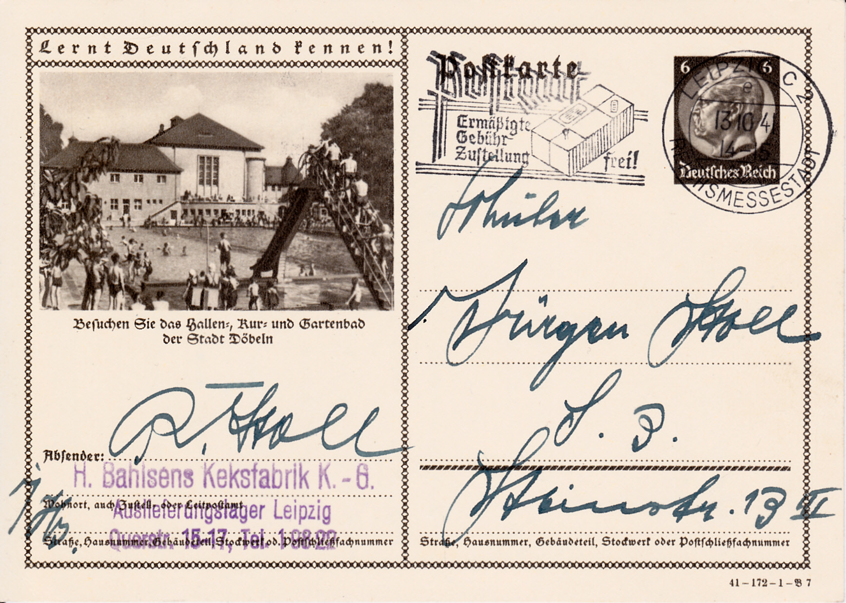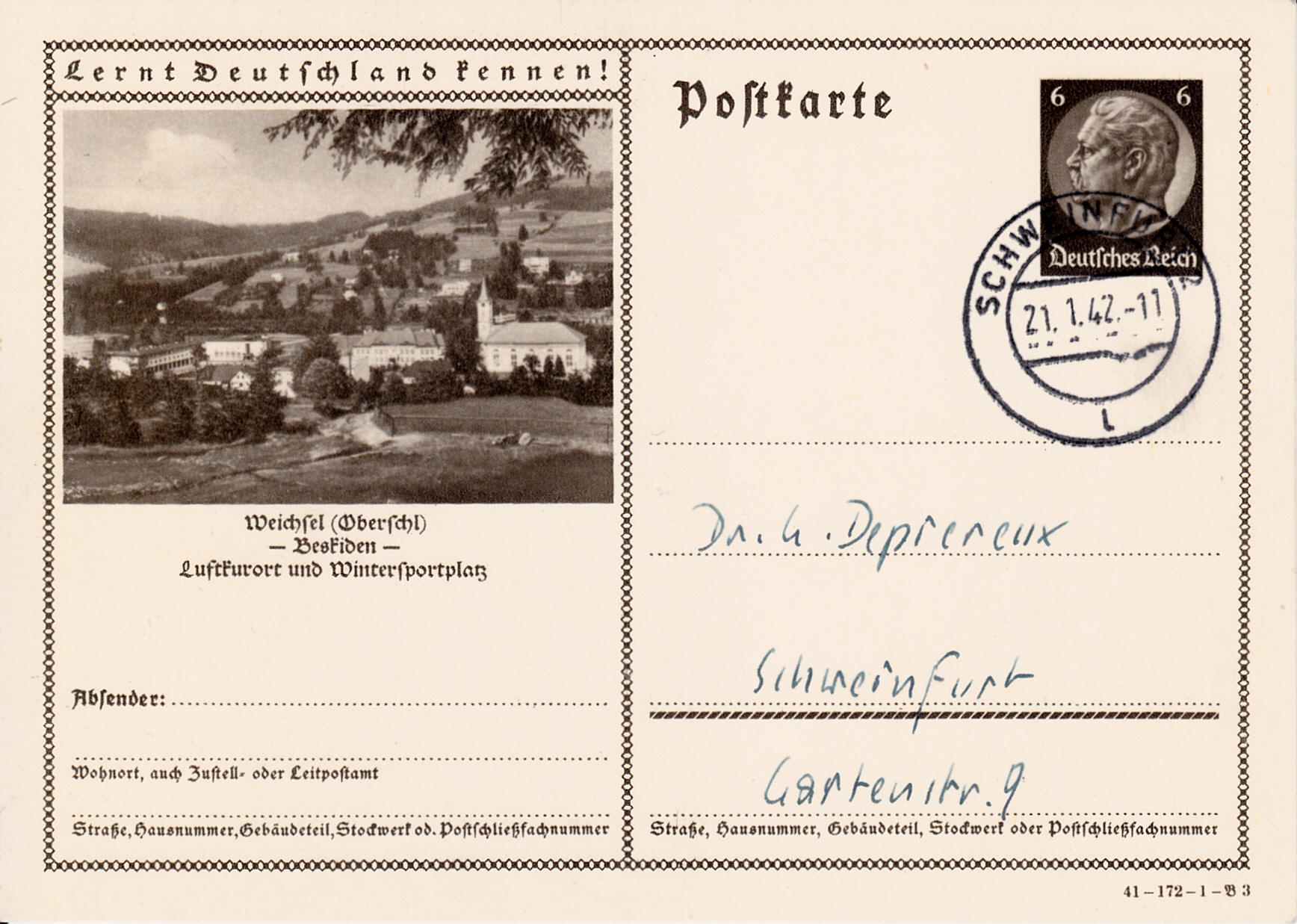 Freiwaldau wiederholt auf dieser Karte (Serie 172 Bild 2) die Werbung für seine Wasserheilanstalt und Kaltwasserkuren nach Vincenz Prießnitz in Gräfenberg. Freiwaldau heißt heute Jeseník (bis 1947 Frývaldov) und ist eine Stadt im tschechischen Olomoucký kraj (Olmützer Region), und Gräfenberg heißt Lázně Jeseník.