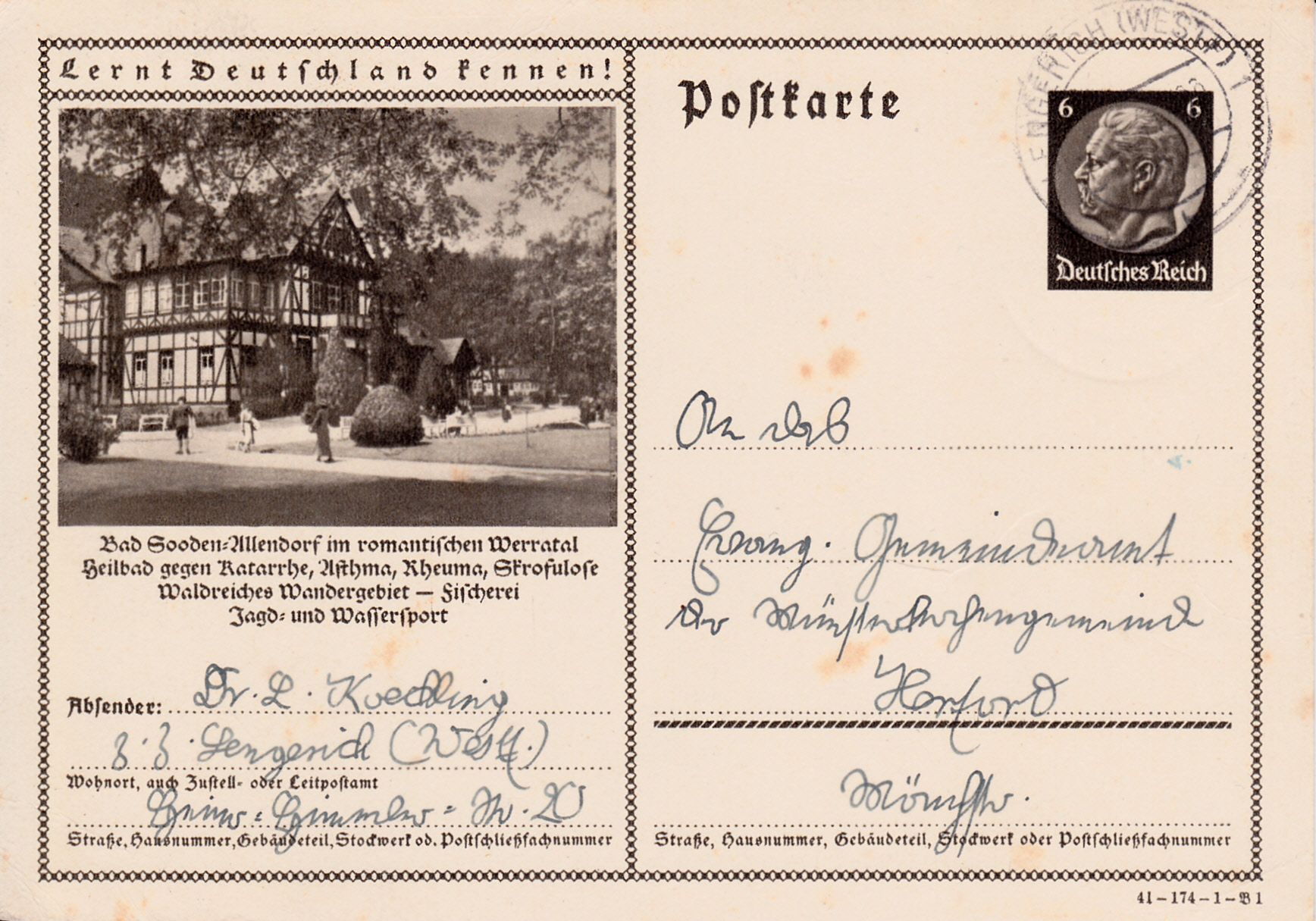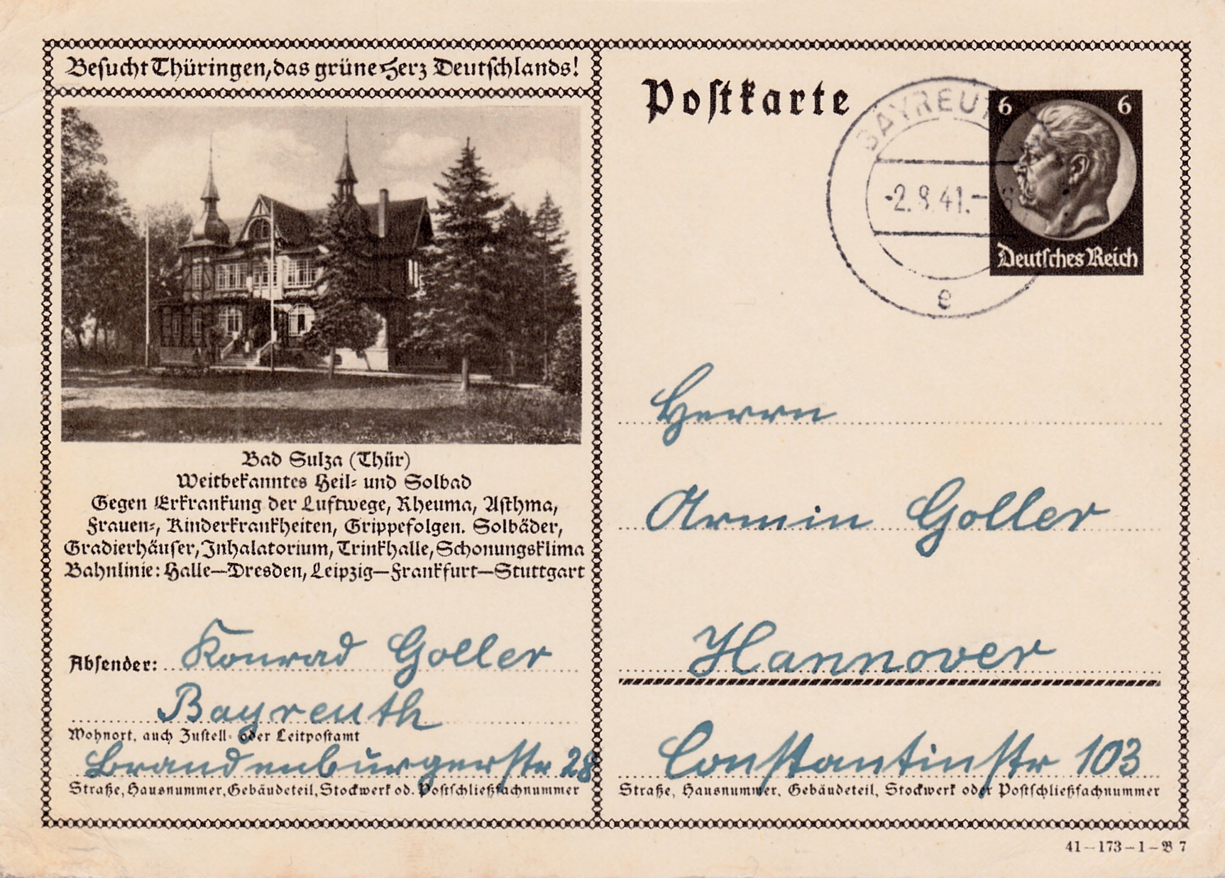 Diese Bildpostkarte 1941 (Serie 173 Bild 4) für Tabarz (Thüringer Wald) unterscheidet sich von einer Vorjahrskarte auch wieder nur im Druckvermerk.