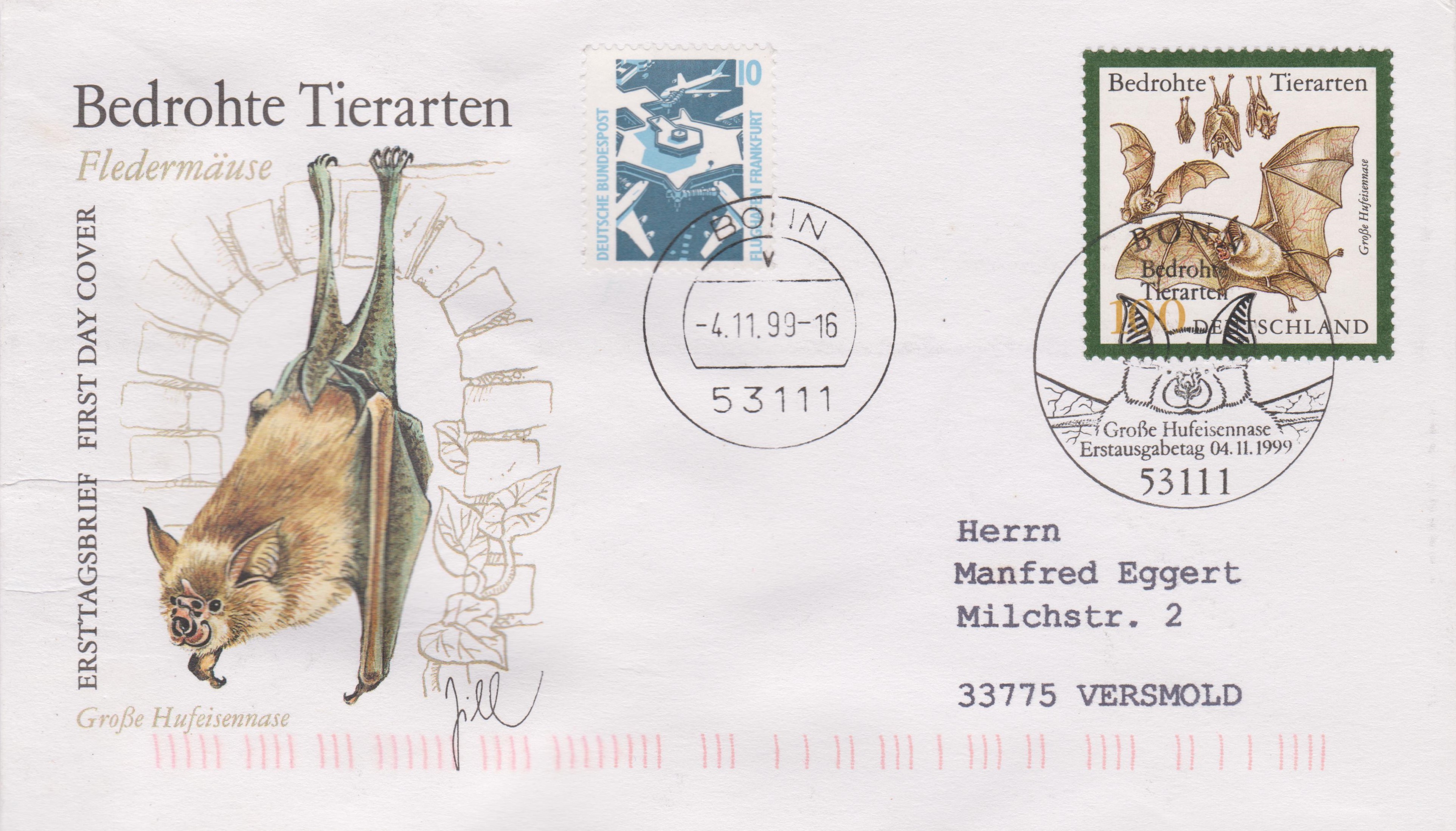 Deutschland MiNr. 2086 mit der Abbildung von mehreren Großen Hufeisennasen (Rhinolophus ferrumequinum) auf echt gelaufenem Ersttagsbrief, entwertet mit Ersttagsstempel 53111 BONN: