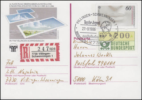 Sonderpostkarte mit dem Wertzeicheneindruck der 60Pf Europamarke 1986 (MiNr PSo 13) zur NAJUBRIA '86 in Villingen-Schwenningen als Einschreiben nach Köln mit dem Sonderstempel zur NAJUBRIA 1986 "Tag der Jugend". Das zusätzliche Porto für Einschreiben 200Pf wurde mit einer Automatenmarke zu 200Pf entrichtet.