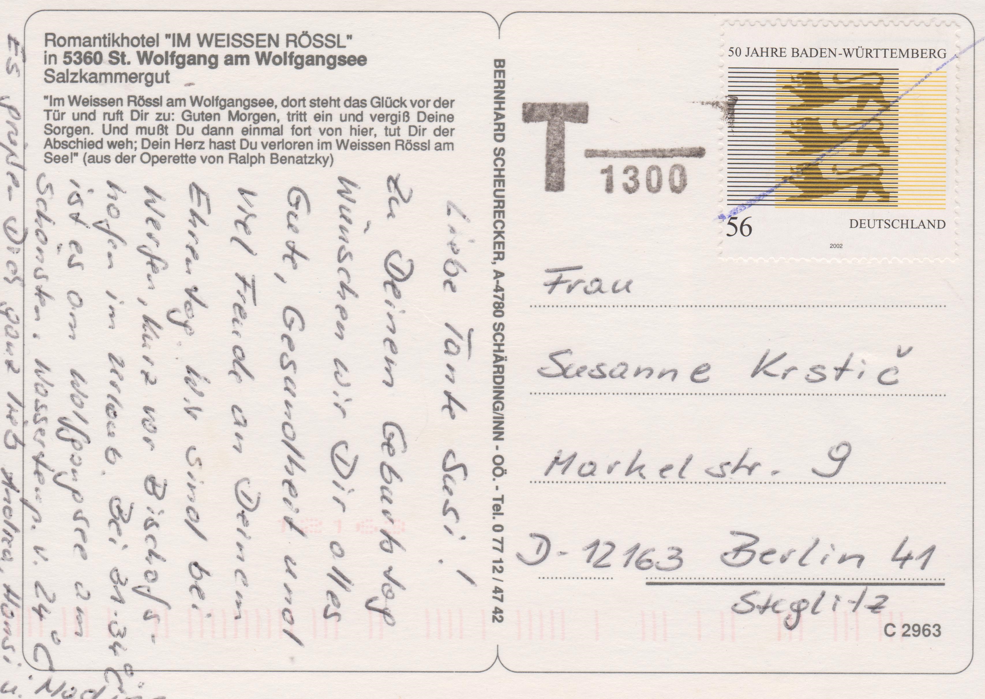 Ansichtskarte aus dem Urlaub am Wolfgangsee in Österreich, frankiert mit einem deutschen Postwertzeichen Bund MiNr. 2248, das in Österreich nicht gültig war: