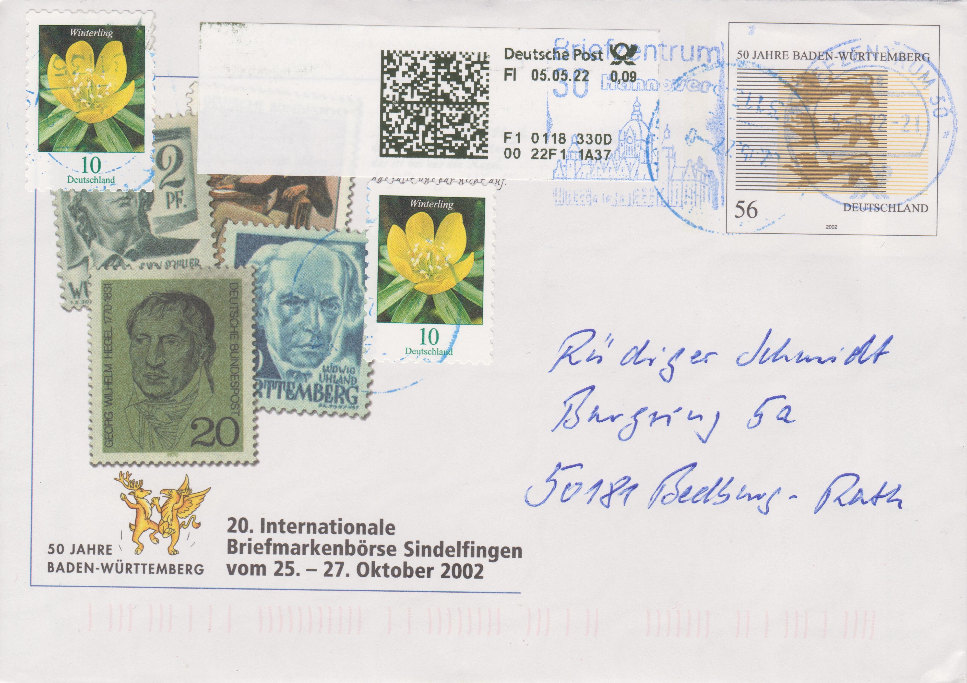 Es wurde ein Taxstempel "T /1300" angebracht. In Deutschland wurde das deutsche Postwertzeichen als Frankatur nachträglich anerkannt und dieses wurde durch einen diagonalen Strich mit Kugelschreiber entwertet. Vorderseitig wurde eine Codierung angebracht, der Beleg ist also echt gelaufen!