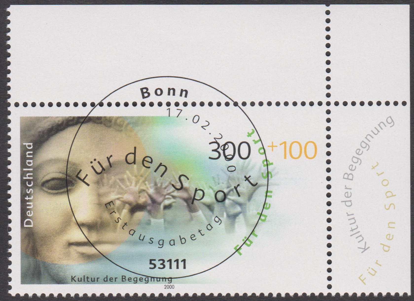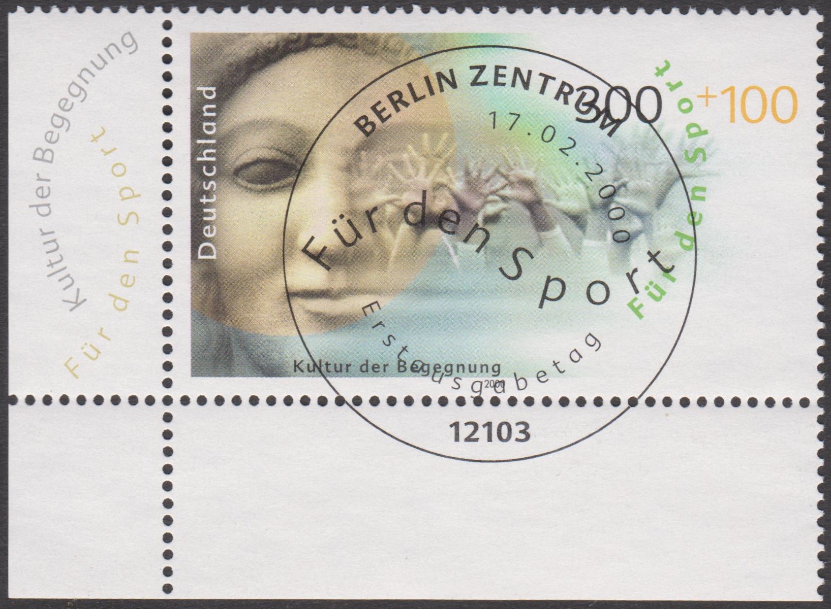 Bund MiNr. 2097 steht unter dem Motto "Kultur der Bewegung", hier als linke untere Bogenecke des Zehnerbogens mit ESST BERLIN: