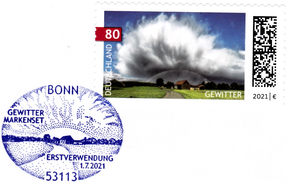 Brief vom Ersttag der Marke "Gewitterwolke" aus der "Himmelserscheinungen" der Deutschen Post (MiNr 3613) mit dem Ersttagsonderstempel aus Bonn. Der Stempel zeigt das Markenbild.