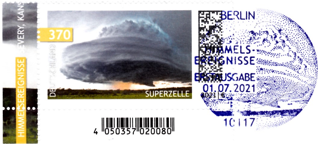 Brief per Einschreiben vom Ersttag der Marke "Gewitter-Superzelle mit inhärentem Mesozyklon" aus der "Himmelserscheinungen" der Deutschen Post (MiNr 3614) mit dem Ersttagsonderstempel aus Berlin. Der Stempel zeigt das Markenbild.