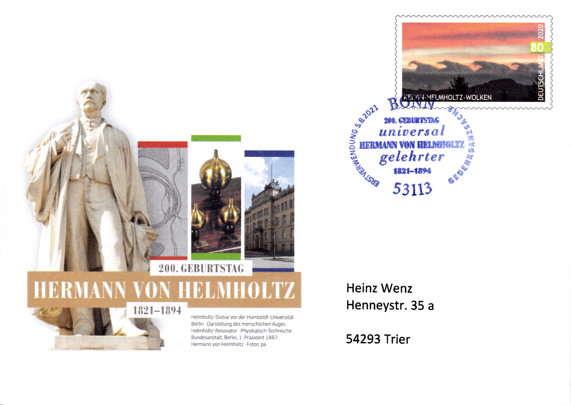 Diese Ganzsache zum 200. Geburtstag von Hermann von Helmholtz hat einen Wertstempel mit der Marke "Kelvin-Helmholtz-Wolken" (MiNr 3527) aus der Serie "Himmelsereignisse".