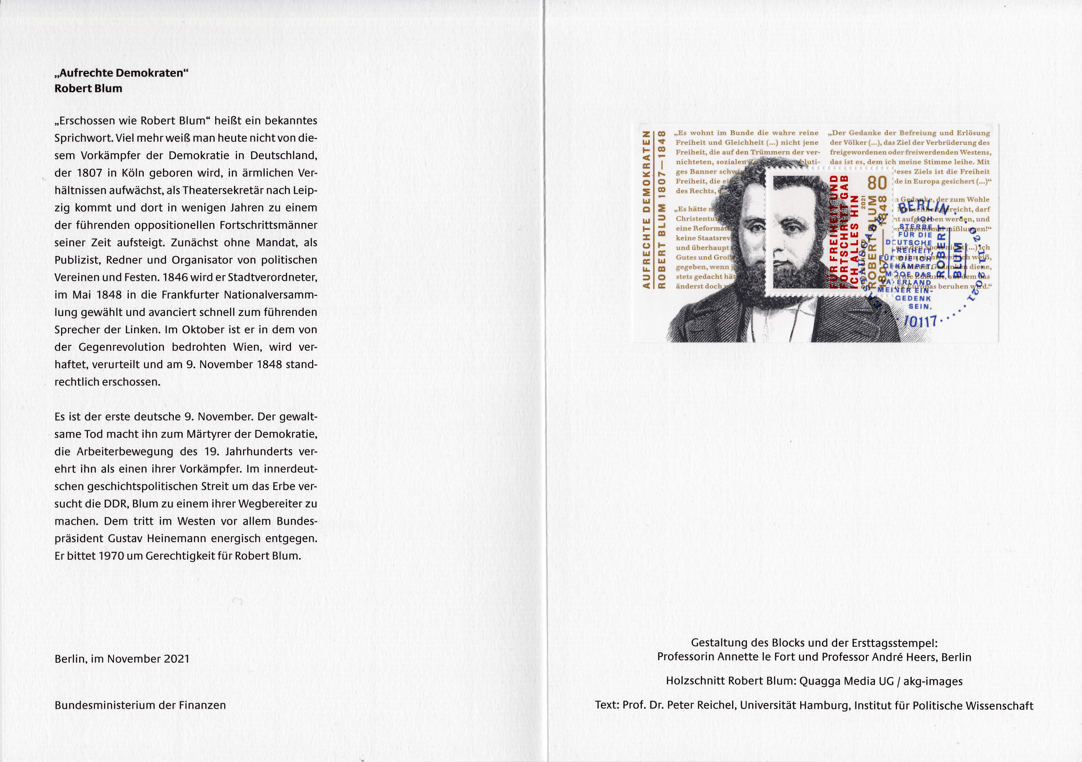Ministerkarte des Bundesministers für Finanzen mit dem Block der Deutschen Post (MiNr Block 89 mit Marke MiNr 3637) aus der Serie "Aufrechte Demokraten" mit Robert Blum und dem Ersttagsonderstempel Berlin. Wegen der Bundestagswahl am 26.9.2021 gab es am Tag der Ausgabe der Marken im November nur einen "geschäftsführenden" Finanzminister. Die Ministerkarten tragen daher keine Unterschrift des Ministers.