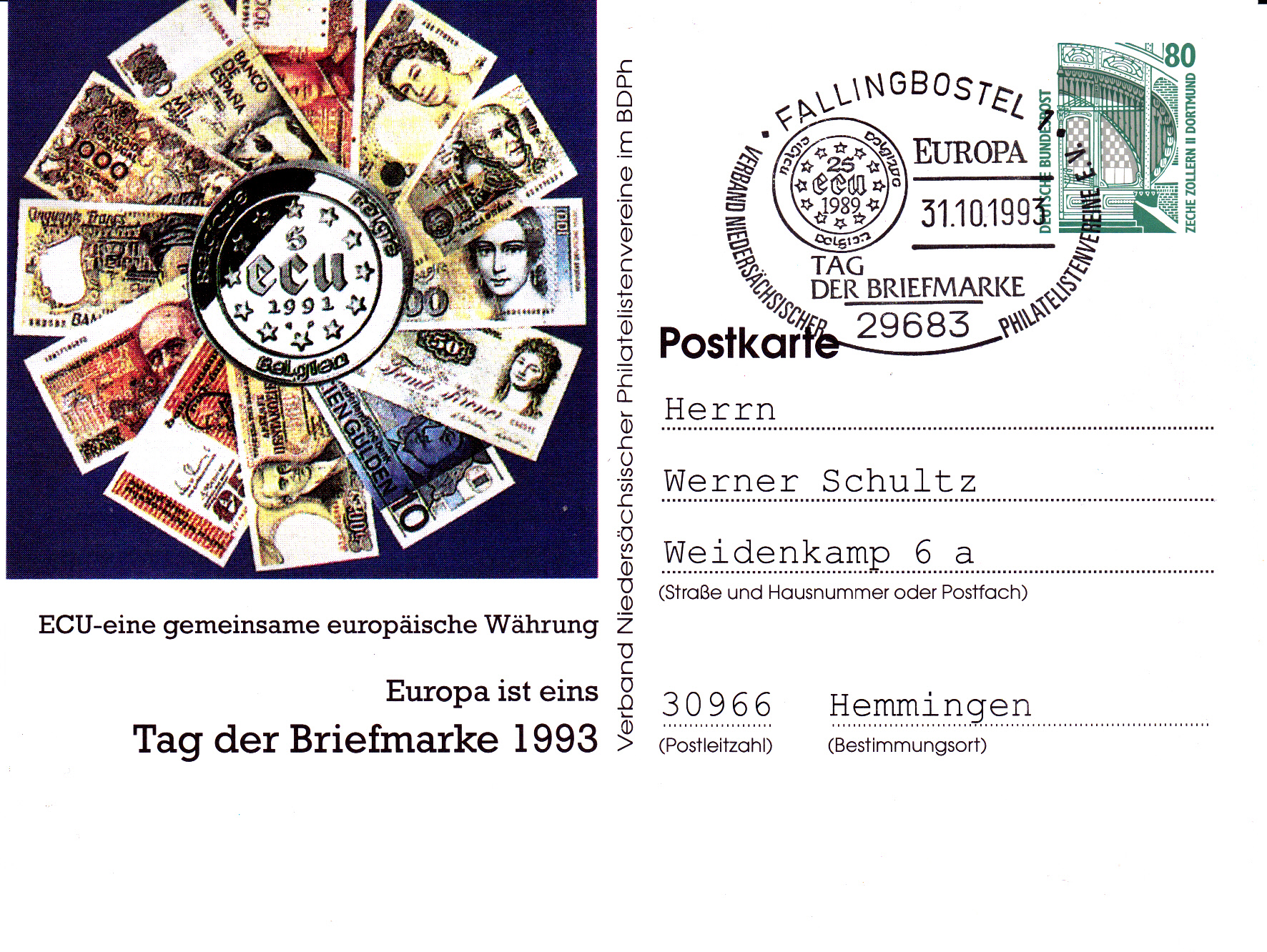 Beim Verband Niedersächsischer Philatelistenvereine wurde als Thema für die Ganzsachenkarte und den Sonderstempel aus 29683 Fallingbostel die Europäische Währung gewählt. Dies war von 1979 bis 1998 die Europäische Währungseinheit (abgekürzt EWE oder ECU vom englischen Namen European currency unit) als Rechnungseinheit der Europäischen Gemeinschaften (EG), später der Europäischen Union (EU) und der Vorläufer des Euro.