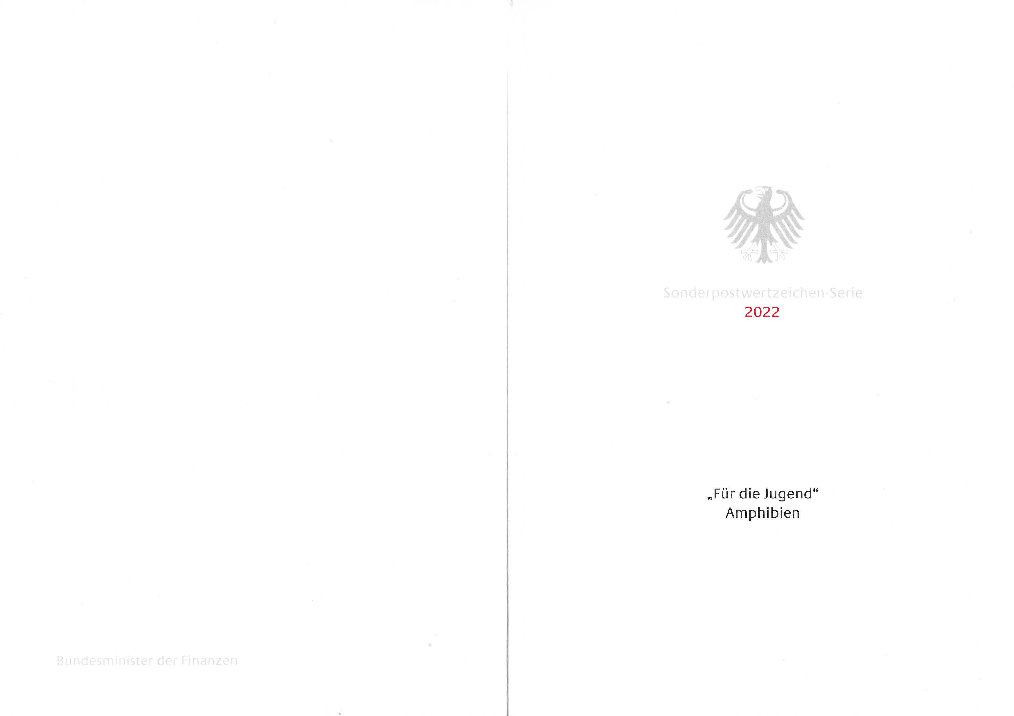 Ministerkarte des Finanzministers mit je einer Marke für die Jugend 2022 (MiNr 3706 bis 3708) mit Motiven zum Thema "Amphibien". Zwei Marken sind mit den Ersttagsonderstempel Bonn gestempelt und eine Marke erhielt den Ersttagsonderstempel Berlin.