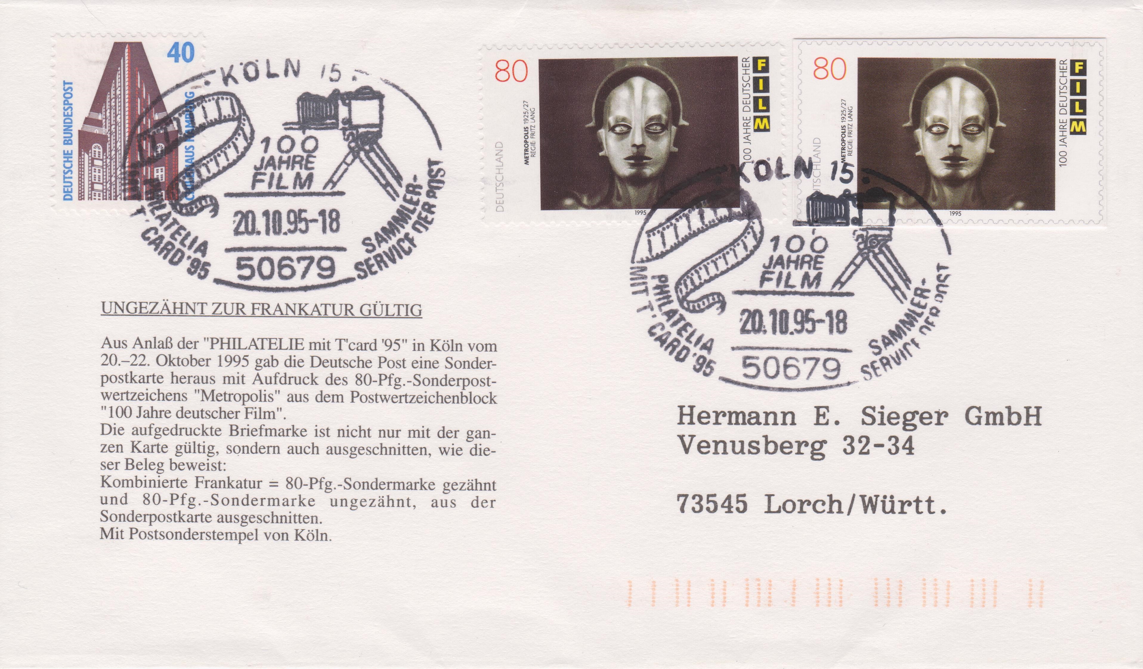 Bund MiNr. 1215 aus Block19 in Mischfrankatur mit einem bildgleichen Ganzsachenausschnitt sowie Zusatzfrankatur: