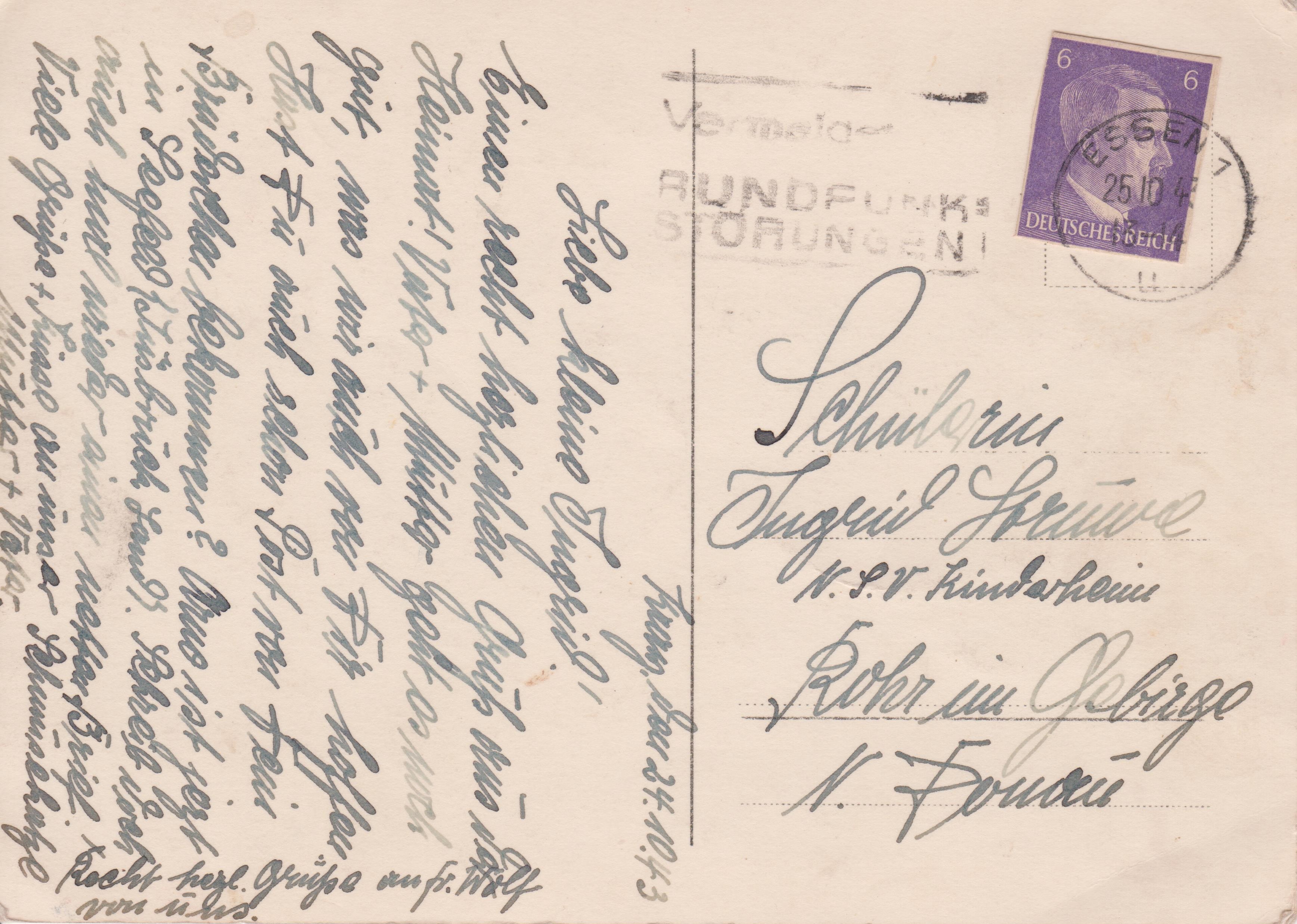 Einzelfrankatur eines GAA der Wertstufe 6 Pf der Freimarke Adolf Hitler, Deutsches Reich MiNr. 785 am 25.10.1943 portogerecht auf Postkarte im Fernverkehr ab ESSEN mit Propaganda-Stempel "Vermeidet RUNDFUNK=STÖRUNGEN!", adressiert nach "Rohr im Gebirge"