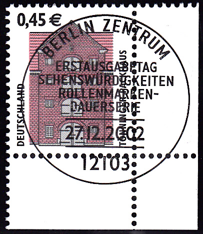 am 21.12.2002 wurde die Marke zu 0,45 € verausgabt, sie zeigt als Motiv das Tönninger Packhaus. Hier einmal als waagerechtes Paar mit Versandstellenstempel: