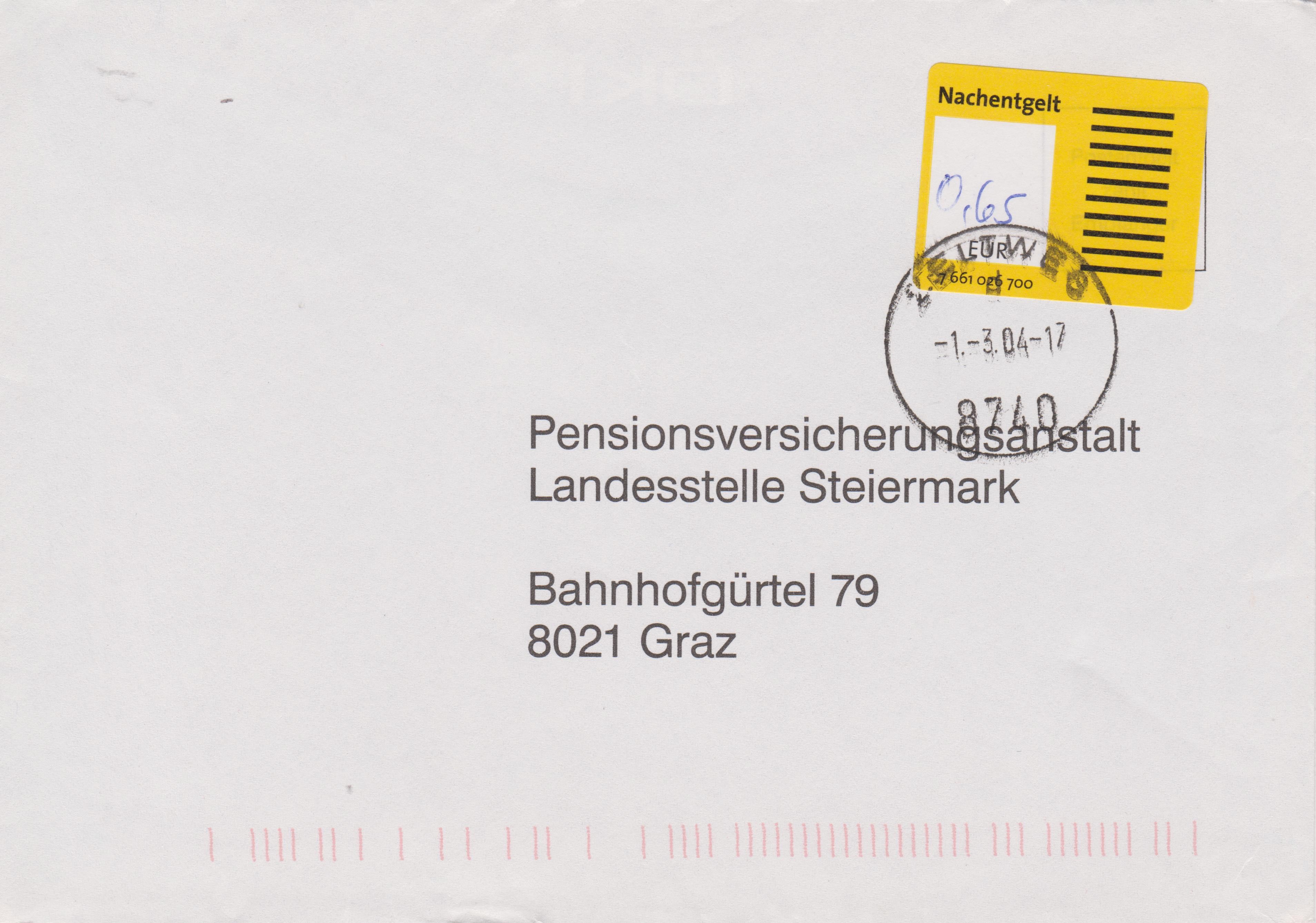 Drei nach 8021 Graz adressierte unfrankierte Briefe mit Aufklebern "Nachentgelt 7 661 026 700" vom 01.03.2004:
