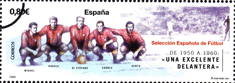 In Spanien erschien 2011 in der Ausgabe "Geschichte der Fußball-Nationalmannschaft" eine Marke (MiNr 4629) mit Francisco Gento (rechter Spieler). Hier zeige ich eine "Mustermarke".