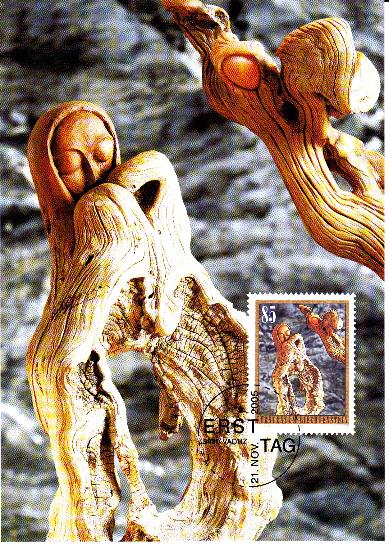 Die Weihnachtsmarken 2005 aus Liechtenstein zeigen Holzskulpturen von Anton Gstöhl (*1939). Auf dem Wert zu 85 Rappen (MiNr 1391) sehen wir "Verkündigung", hier auf einer Maximumkarte der Post in Liechtenstein.