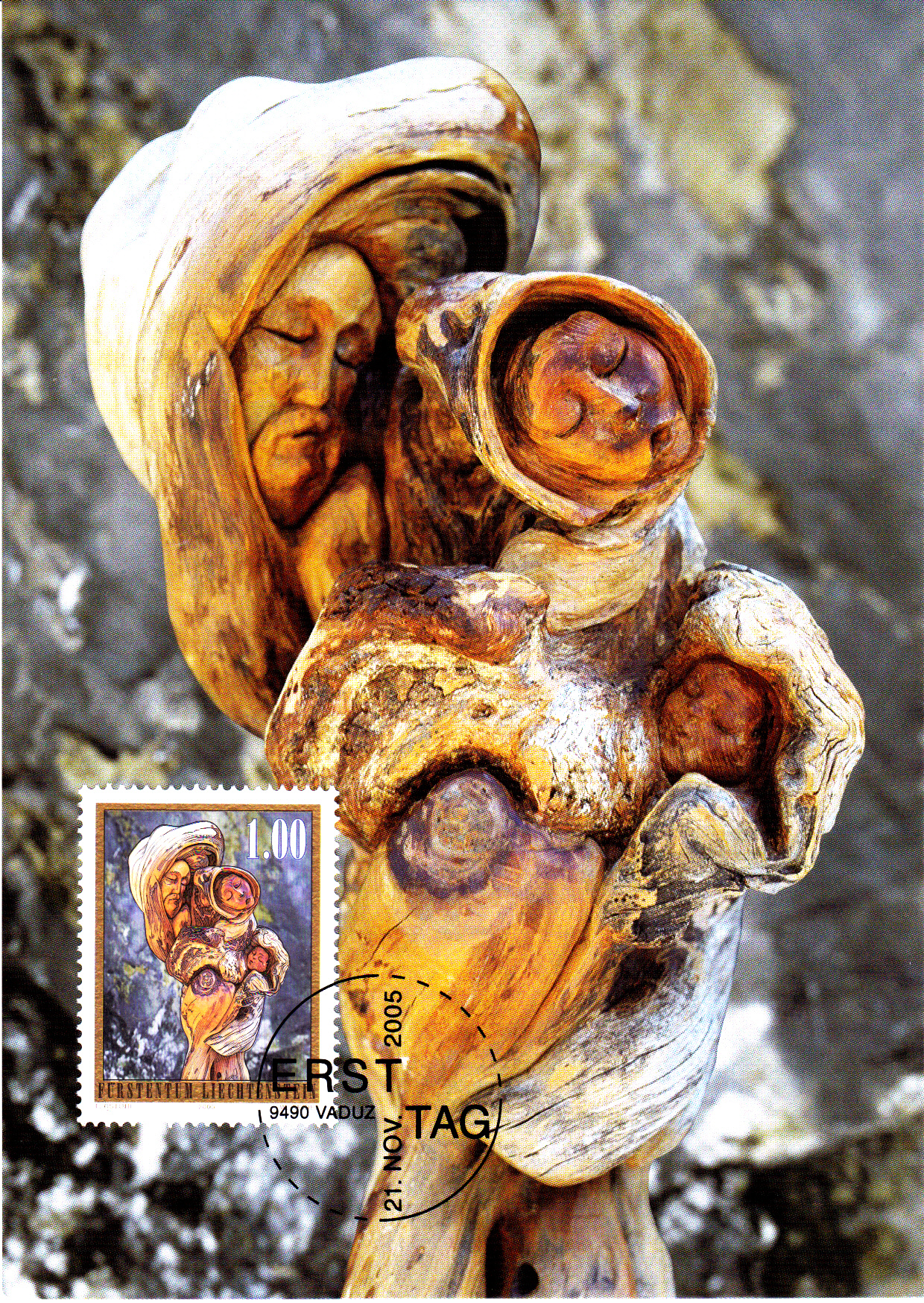 Die Weihnachtsmarken 2005 aus Liechtenstein zeigen Holzskulpturen von Anton Gstöhl (*1939). Auf dem Wert zu 100 Rappen (MiNr 1392) sehen wir die "Hl. Familie", hier auf einer Maximumkarte der Post in Liechtenstein.