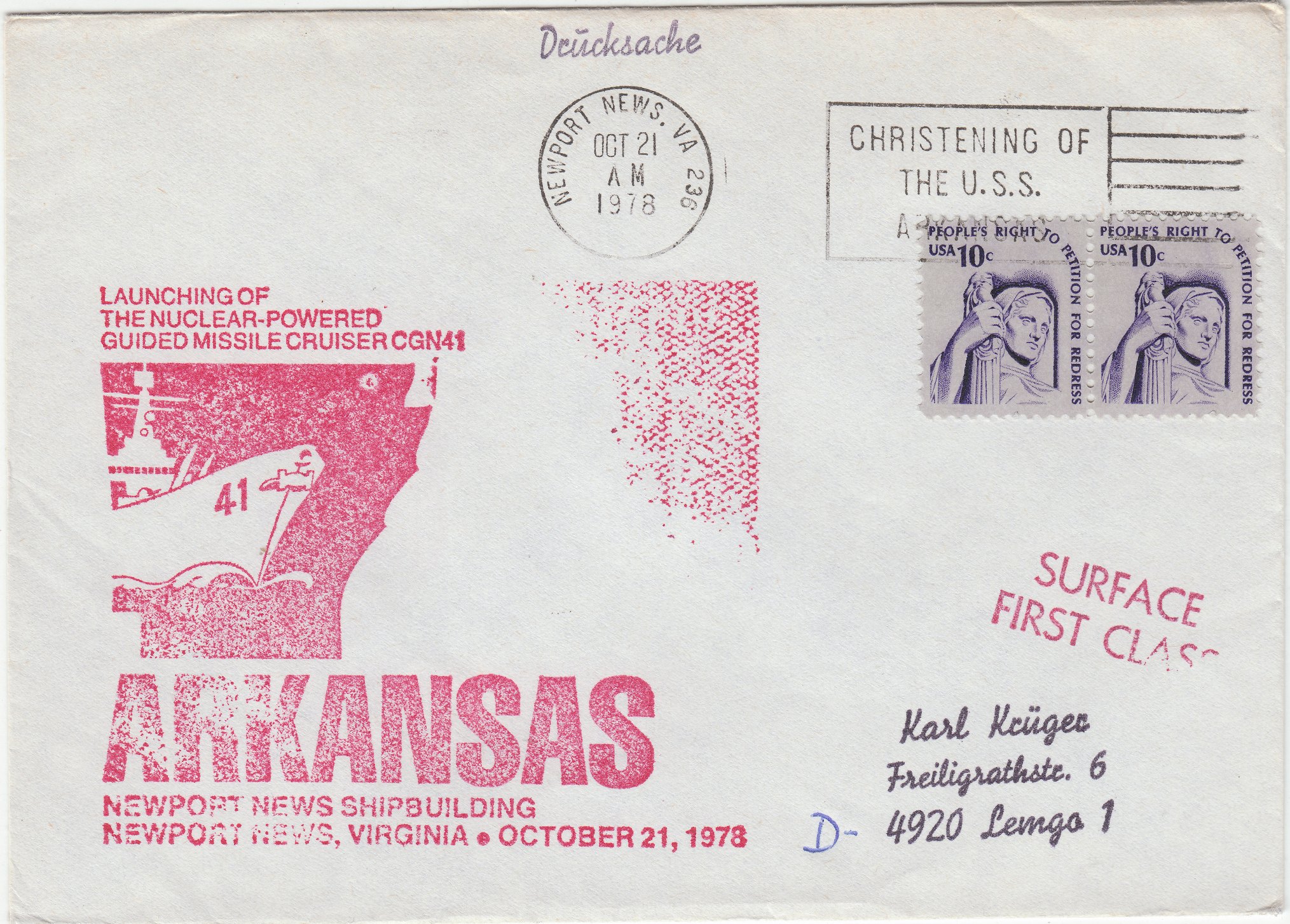 Dieser Beleg vom 21.10.1978 dokumentiert per Cachetstempel in Rot den Tag des Stapellaufs der USS ARKANSAS sowie per Maschinenstempel mit entsprechendem Einsatz die Schiffstaufe: