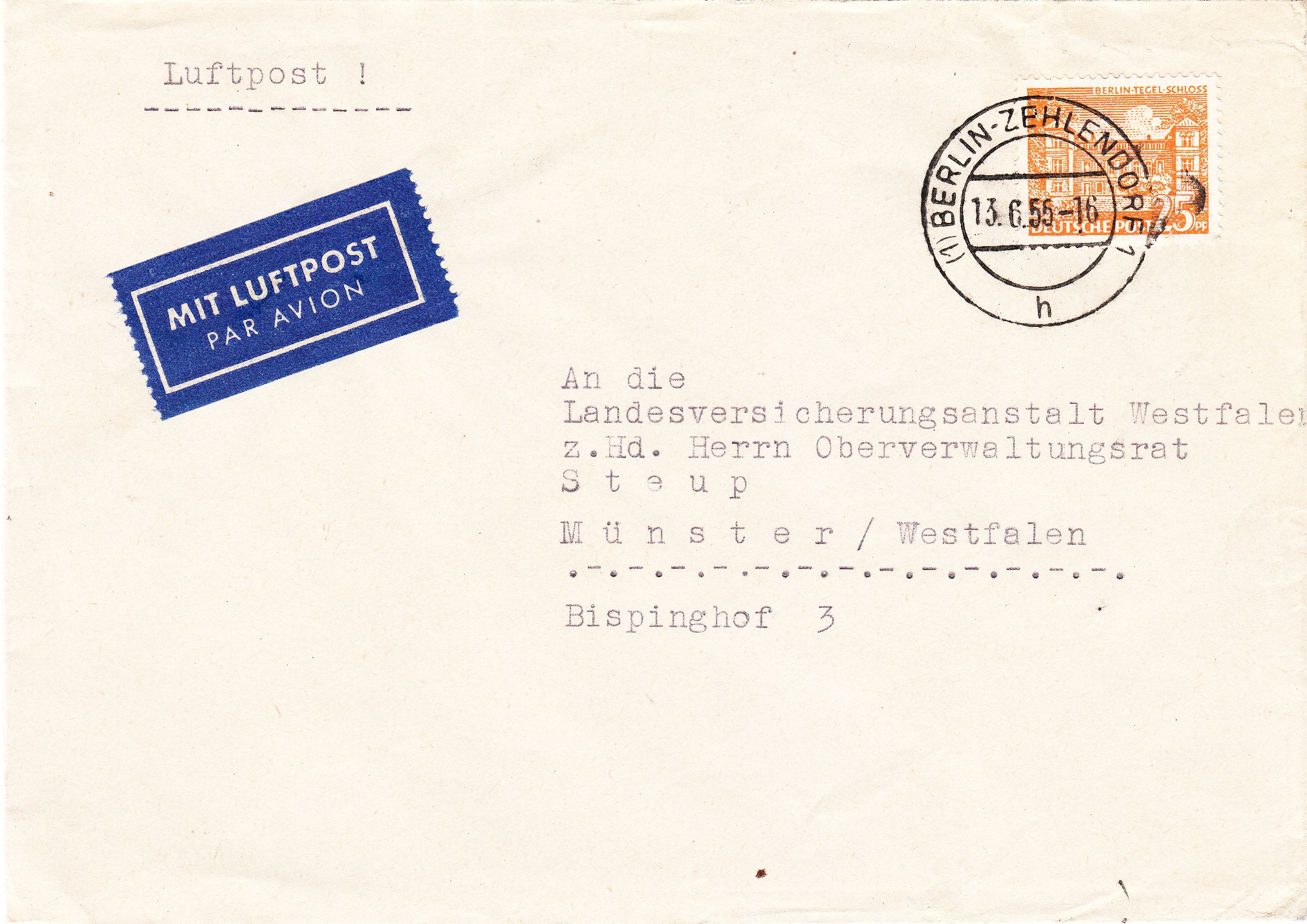 Dieser Brief lief am 13.06.1955 ab Berlin nach Münster/Westfalen und wurde daher per Luftpost von Berlin nach Düsseldorf befördert: