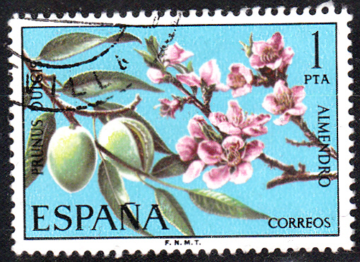 Diese Marke aus Spanien (MiNr 2146) bildet einen blühenden Mandelzweig und einen Zweig mit den Früchten ab.