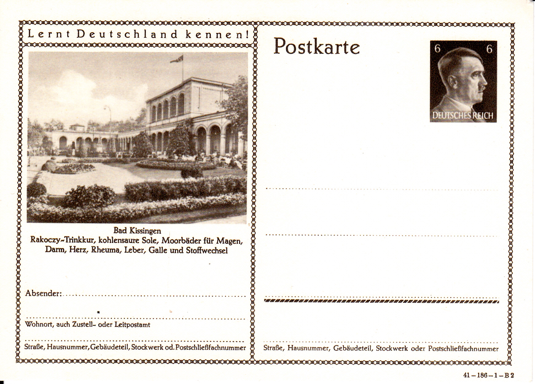 Auf einer zweiten Karte (Serie 186 Bild 3) wiederholt Bad Kissingen das Foto mit dem Regentenbau in Bad Kissingen, das bereits in früheren Jahren Verwendung fand.
