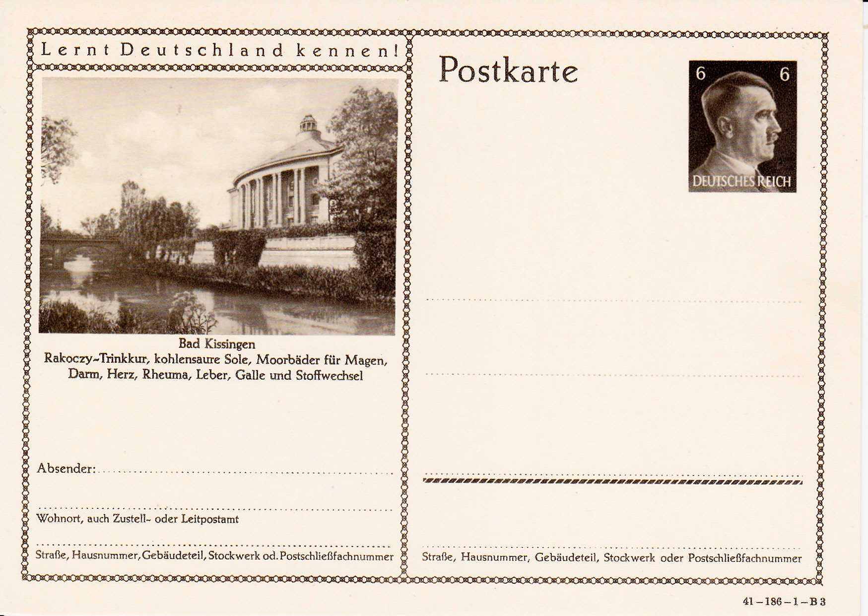 Auf einer zweiten Karte (Serie 186 Bild 3) wiederholt Bad Kissingen das Foto mit dem Regentenbau in Bad Kissingen, das bereits in früheren Jahren Verwendung fand.