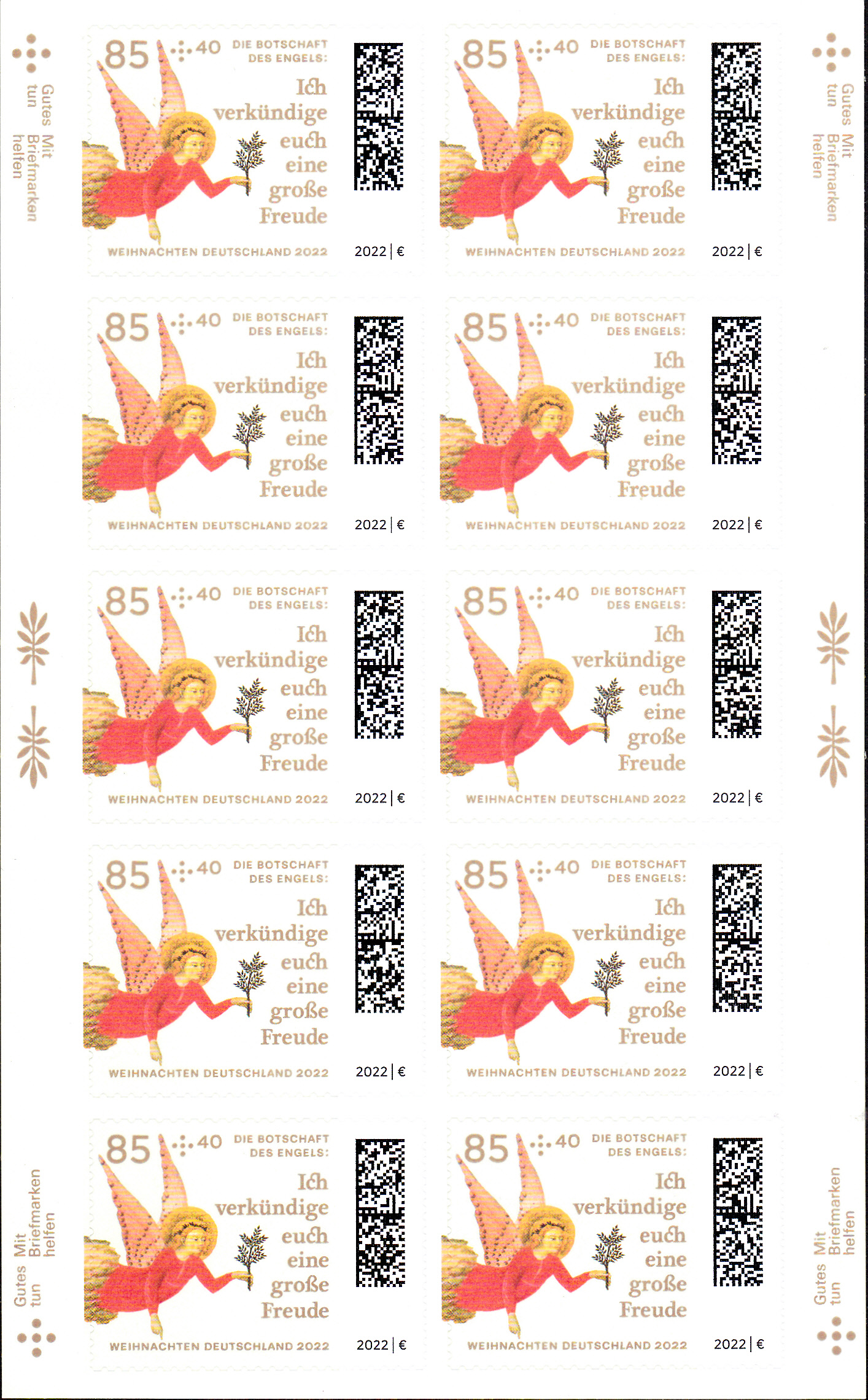 Auch 2022 gibt es bei der Deutschen Post eine zweite Weihnachtsmarke (MiNr 3728) ohne Zuschlag. Sie wünscht allen Empfängern "Friedvolle Weihnachten" und zeigt einen verschneiten Fichtenwald.