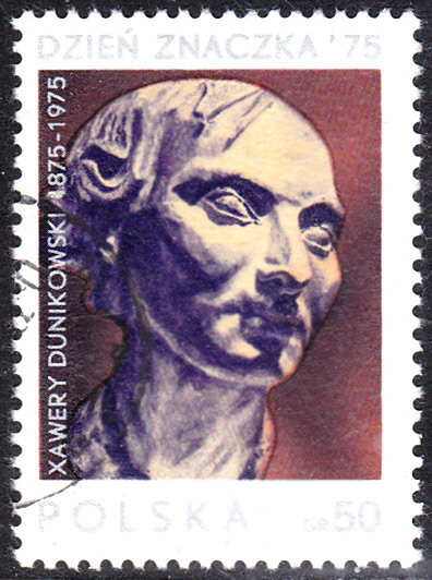 Zum Tag der Briefmarke 1975 sind in Polen in einer Serie Marken mit Werke von Xawery Dunikowski (1875-1964, Bildhauer) erschienen. Auf dieser Marke (MiNr 2409) ist ein "Selbstporträt" von Xawery Dunikowski aus dem Zyklus "Wawel-Köpfe" abgebildet.