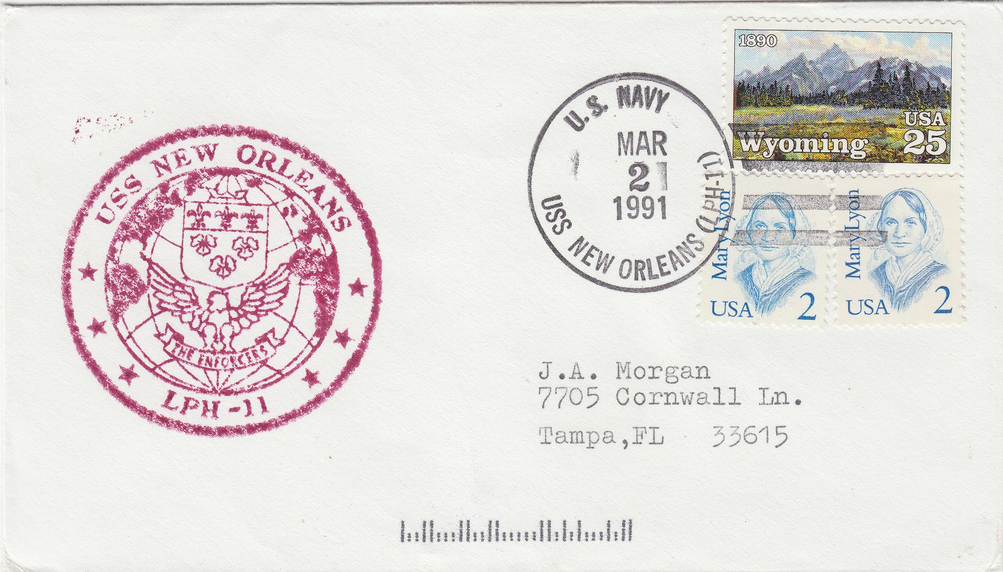 Dieser Beleg wurde am 02.03.1991 an Bord der USS NEW ORLEANS LPH-11 aufgegeben, also während der vom 01.12.1990 bis zum 28.08.1991 dauernden Operationen Desert Storm und Desert Shield.