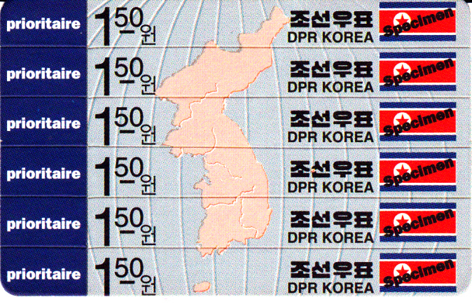 Als erste Postverwaltung verausgabte die nordkoreanische Post eine sogenannte "STAMPCARD". Diese Konfektionierungsform wurde von einer schwedischen Firma mit dem Namen "PostLine (International) AB" entwickelt und verschiedenen Postverwaltungen unter dem Namen "STAMPCARD TM" angeboten. Die Stampcards haben die Größe der damals häufig benutzten Telefonkarten und konnten somit auch über die gleichen Automaten verkauft werden. Hier zeige ich die erste Stampcard (MiNr. 3433-3438). Die 6 waagerechten Markenstreifen sind selbstklebend und auf einem Kunststoffträger aufgebracht. Die Abbildung auf den "Marken" zeigen je einen Teil der Karte der koreanischen Halbinsel und die Flagge von Nordkorea. Links von jeder Marke befindet sich ein abtrennbares Feld mit Angabe der Versendungsart "prioritaire". Beim hier gezeigten Exemplar handelt es sich um eine Musterkarte, erkennlich am Aufdruck "Specimen" über den Flaggen der Marken.