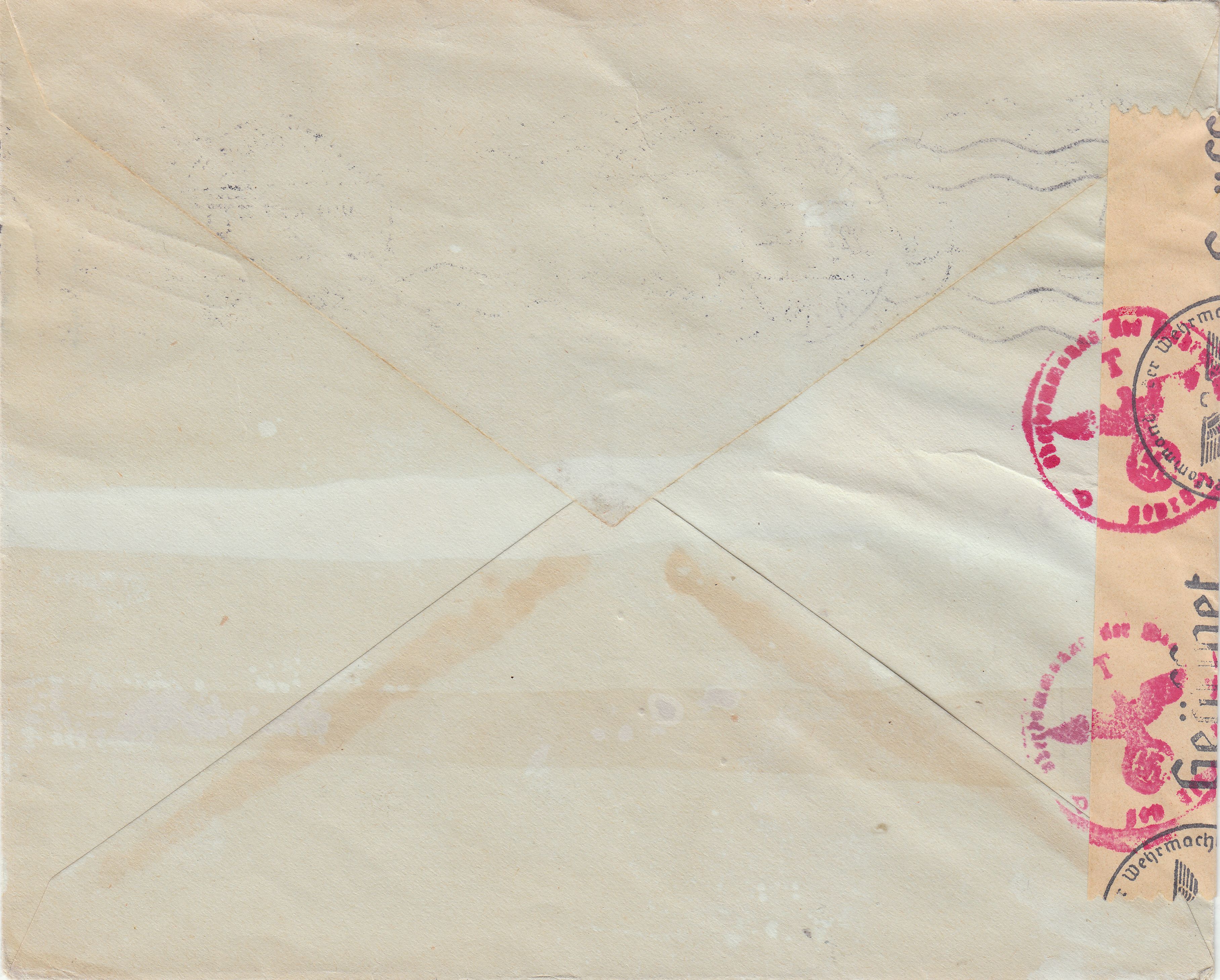 Der Brief durchlief die Auslandsbriefprüfstelle in Berlin, wo er linksseitig geöffnet und nach erfolgter Prüfung mit einem Verschlußstreifen "GEÖFFNET Oberkommando der Wehrmacht b" verschlossen, was rückseitig zwei roter Stempel dokumentieren.