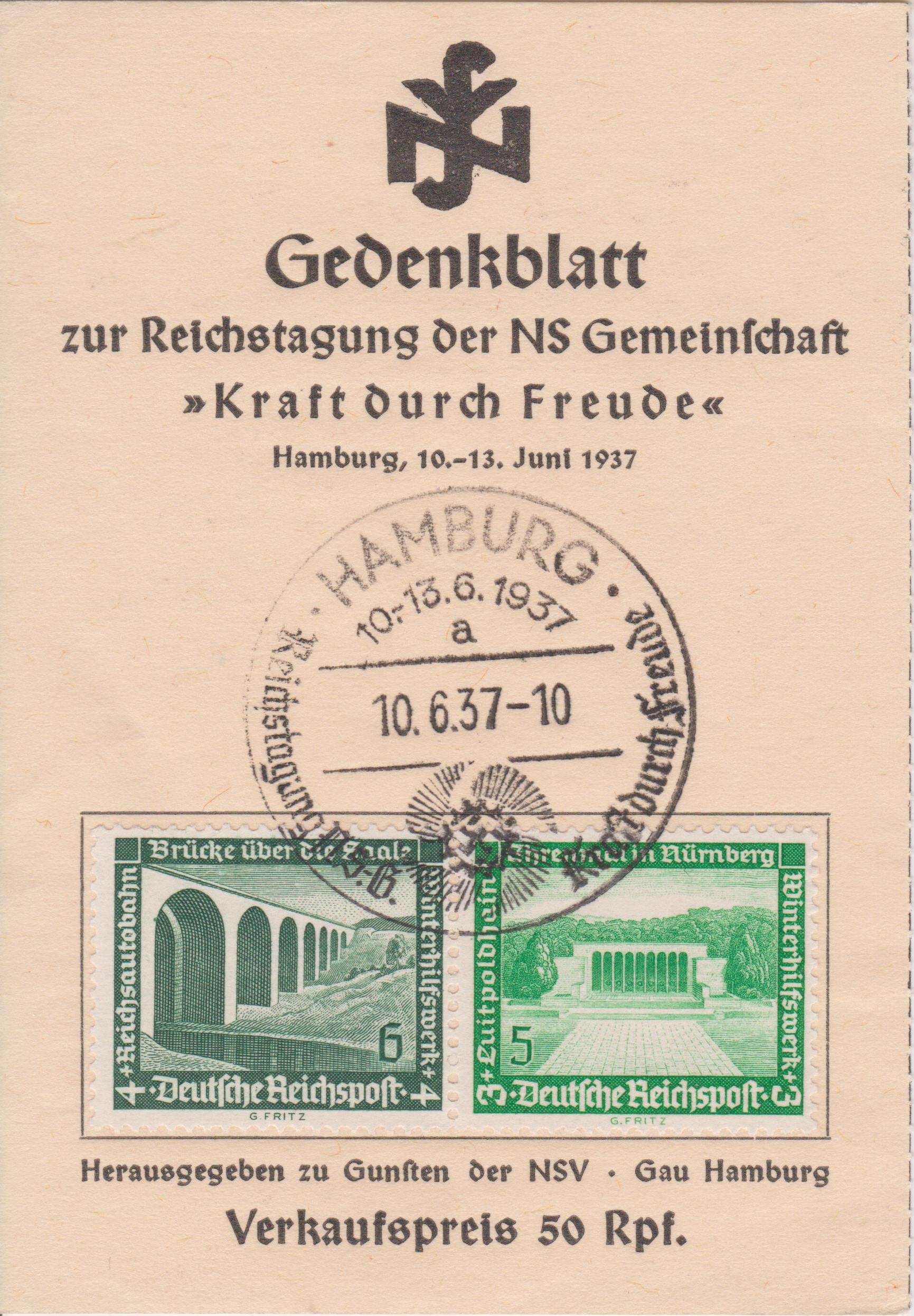 Dieses "Gedenkblatt zur Reichstagung der NS Gemeinschaft Kraft durch Freude" mit Sonderstempel wurde in HAMBURG am 10.061937 für 50 Rpf verkauft: