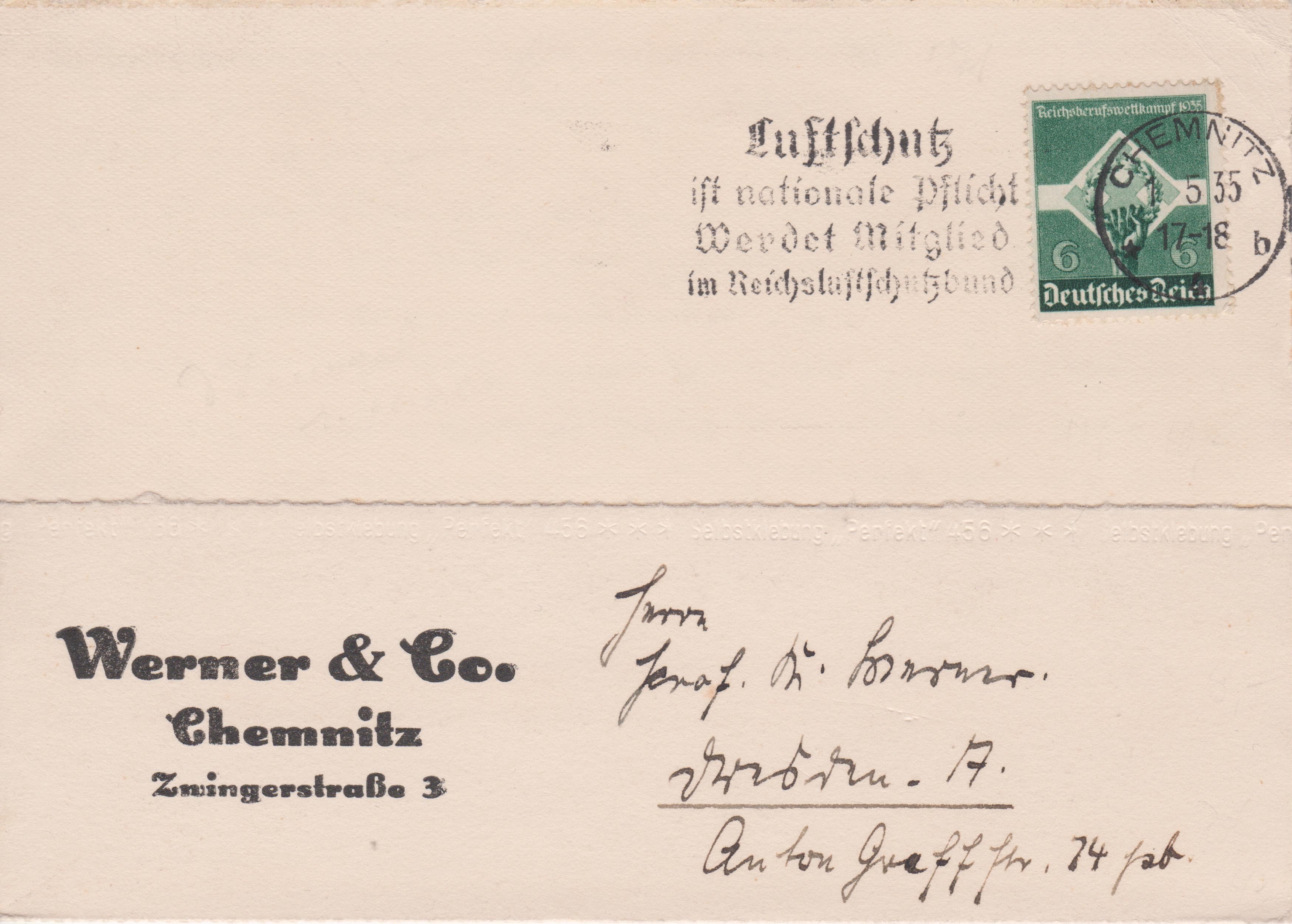 Maschinenstempel aus CHEMNITZ mit Werbeeinsatz "Luftschutz / ist nationale Pflicht / Werdet Mitglied / im Reichsluftschutzbund".