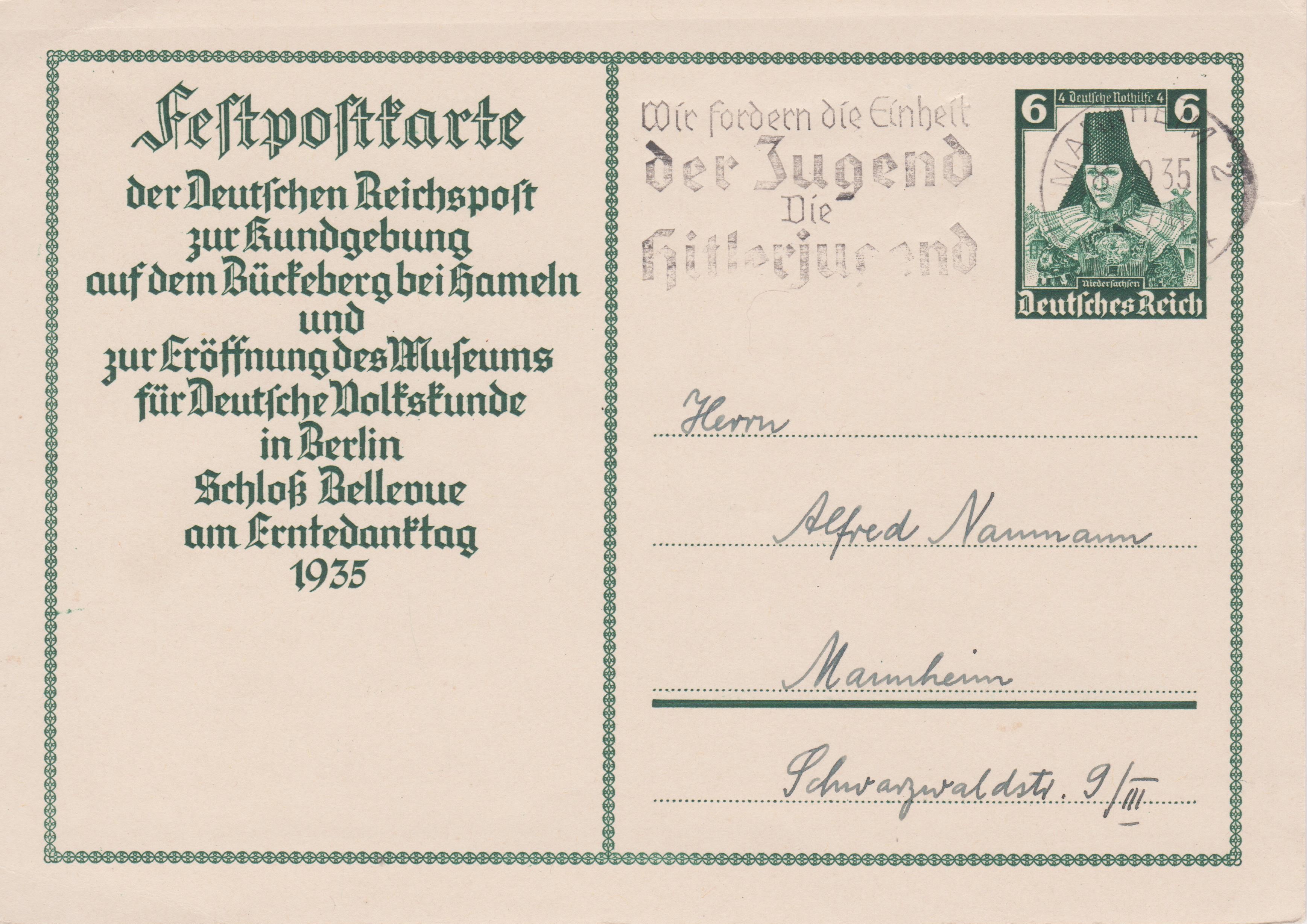 EF der MiNr. 516 auf Postkarte im Fernverkehr, am 04.05.1939 aufgegeben in LUDWIGSHAFEN, entwertet per Maschinenstempel mit Propagandaeinsatz "Heim der Hitlerjugend Helft der Jugend Heime bauen!", adressiert nach Ilmenau in Thüringen: