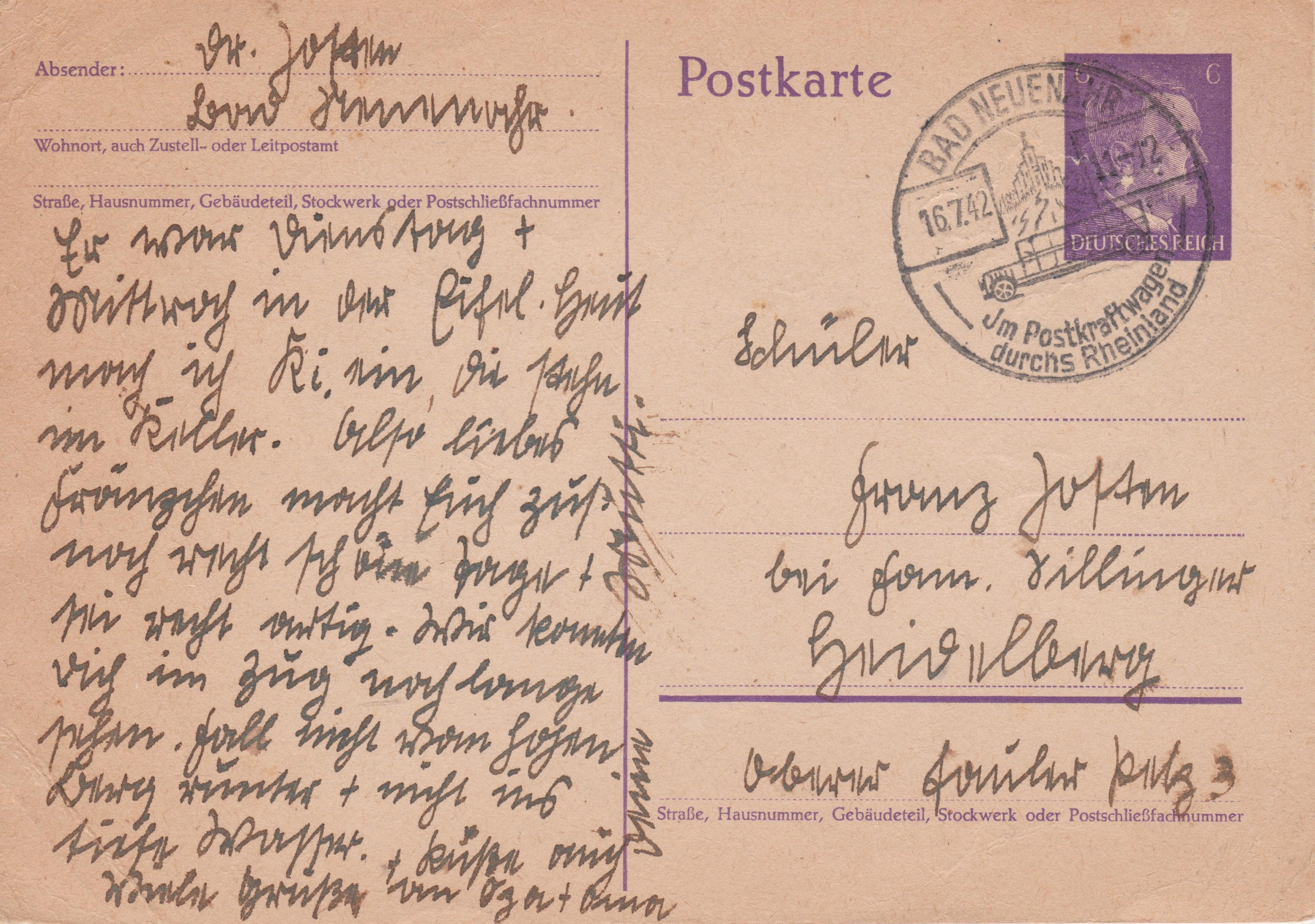 Deutsches Reich Ganzsache 6 Pf Dauerserie Adolf Hitler am 16.07.1942 mit Sonderstempel "BAD NEUENAHR Im Postkraftwagen durchs Rheinland":