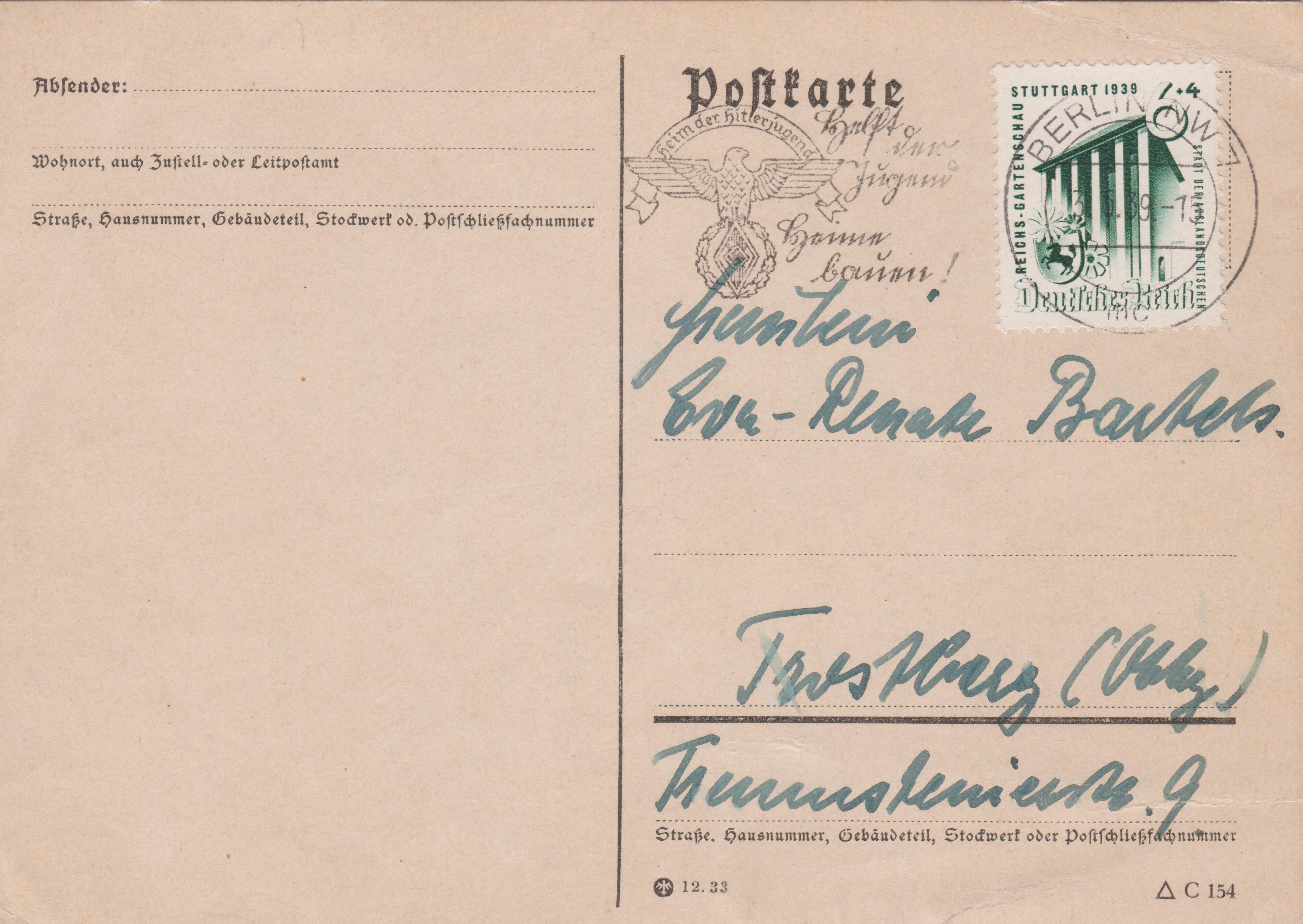 Deutsches Reich MiNr. 692 portogerecht als EF auf Postkarte im Fernverkehr, entwertet am 03.05.1939 in BERLIN mit Maschinenstempel "Heim der Hitlerjugend":