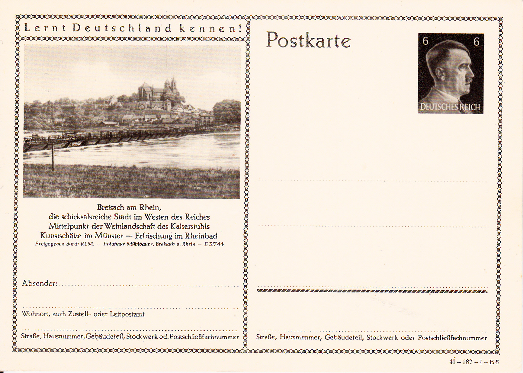 Breisach am Rhein zeigt auf dieser Karte (Serie 187 Bild 6) ein Foto mit dem dem Rhein und dem Breisacher Stephansmünster, einer romanisch-gotischen Kirche und Wahrzeichen der Stadt.