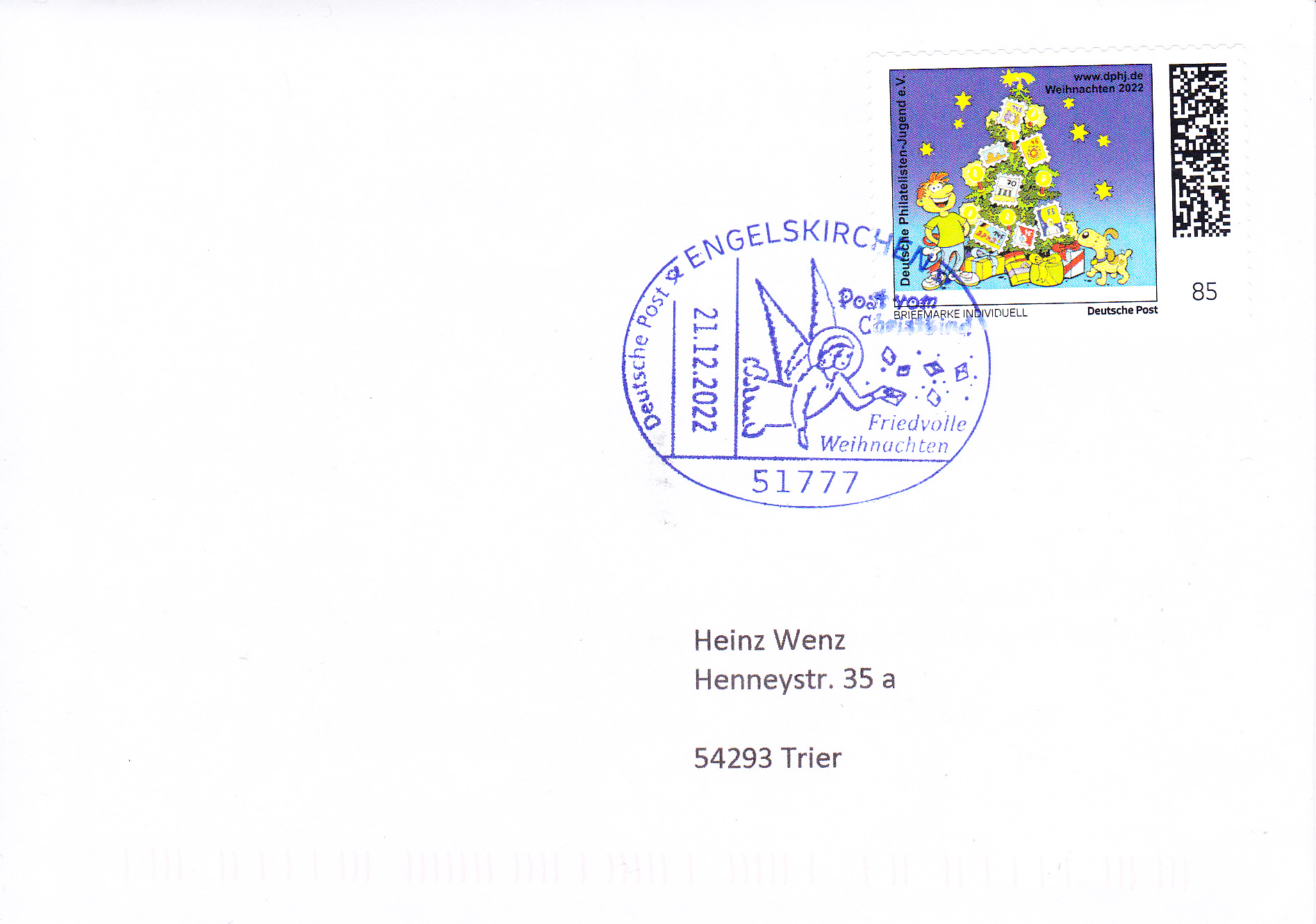 Eine weitere Weihnachtsmarke der DPhJ ist auf diesem Brief im Stempelzentrum Weiden mit dem gleichen SST aus Engelskirchen gestempelt worden und hat danach das Briefzentrum 92 durchlaufen und ist dabei dort noch mit dem Maschinenstempel des BZ 92 "verschönert" worden!!!