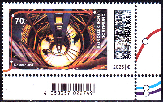 In der Serie "U-Bahn-Stationen" der Deutschen Post ist auch eine Marke (MiNr 3759) mit einer Abbildung aus der U-Bahn-Station Reinoldikirche erschienen. Hier zeige ich ein Eckrandstück mit EAN-Codierung.