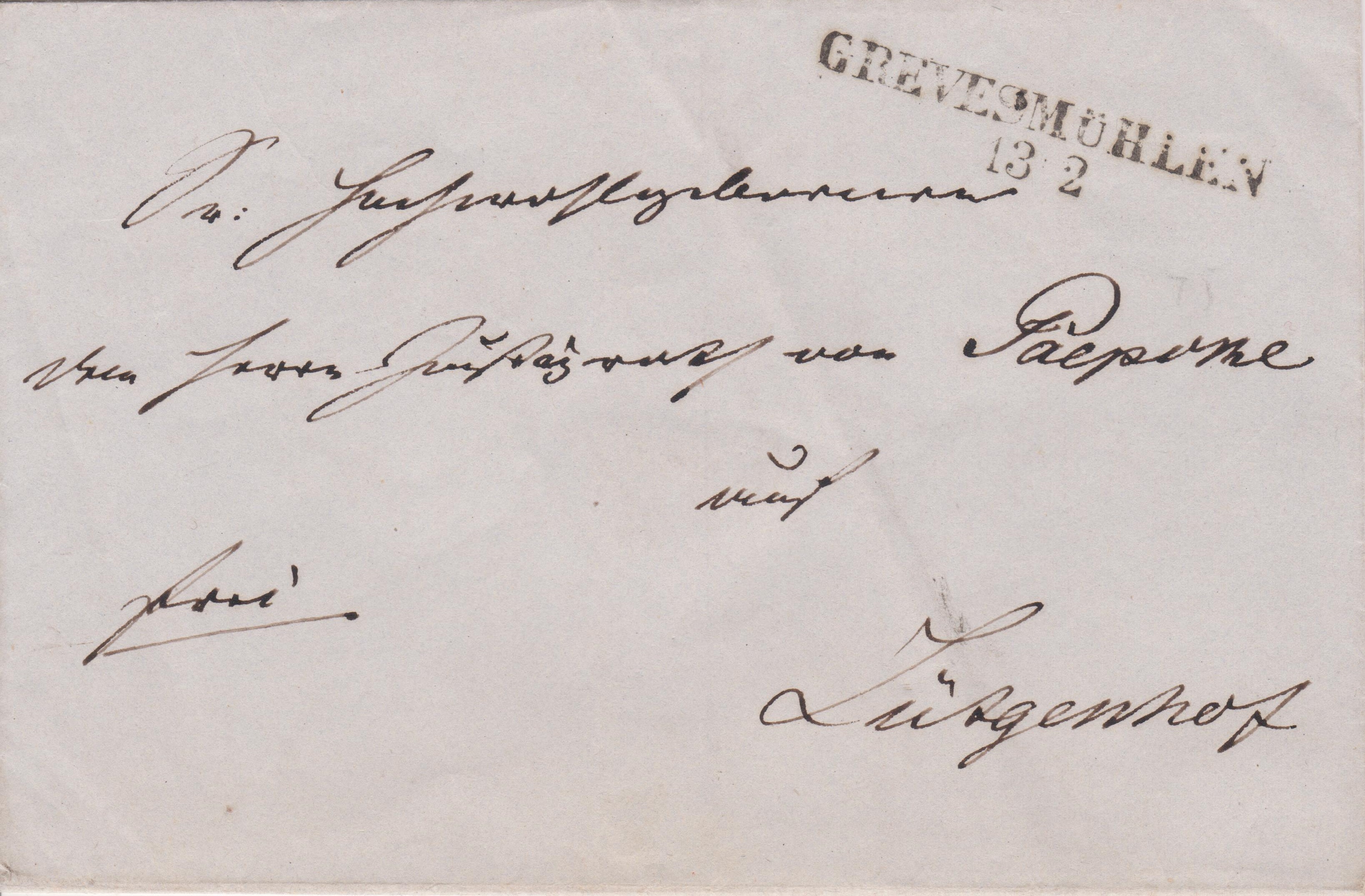 Brief, adressiert nach "Zütgenhof", aufgegeben am 13.02. in "GREVESMÜHLEN", mit Vermerk "frei" und Zweizeilenstempel: