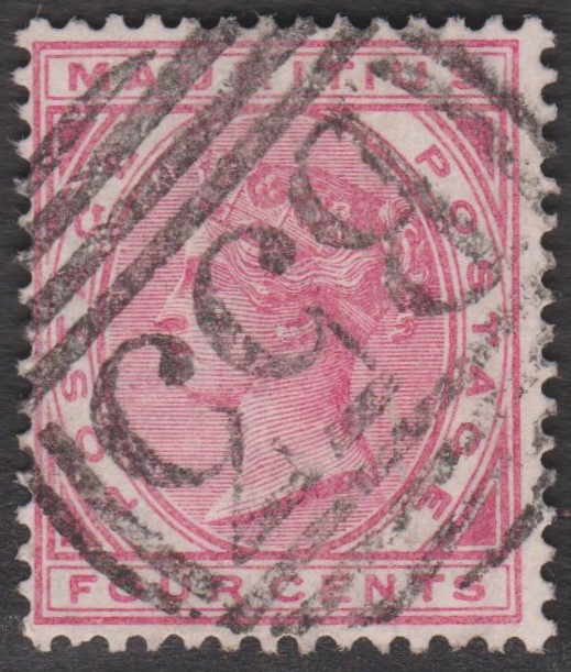 Freimarke Königin Viktoria, Wertstufe 4 Cent, Wasserzeichen 2, Mauritius MiNr. 68 mit Stempel "B53" = Port Louis: