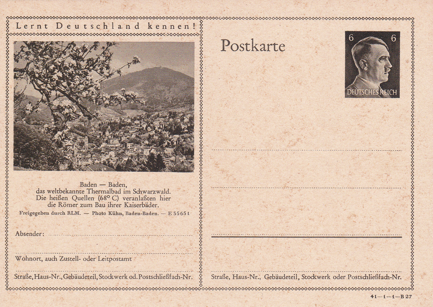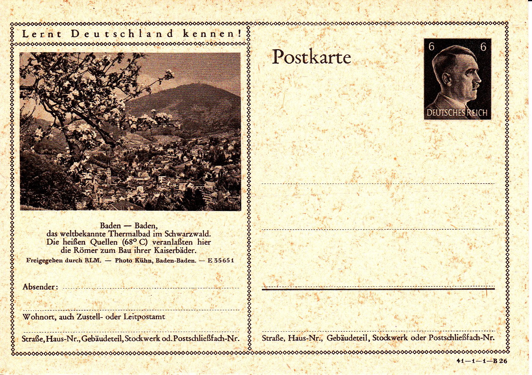 Ich beginne mit der Karte mit dem Druckvermerk 41-1-1-B1 (Ausgabejahr 1941-Serie 1-Druckplatte 1-Bild 1; bei weiteren Karten nenne ich jeweils die Serie und die Bildnummer, die Druckplattennummer nur, wenn es verschiedene Druckplattennummern bei der jeweiligen Serie gibt).