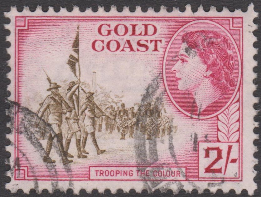Goldküste MiNr. 147 erschien am 01.03.1954 und zeigt als Motiv eine Flaggenparade:
