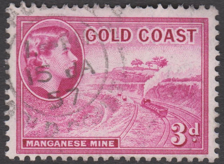 Goldküste MiNr. 143 erschien am 01.04.1953 und zeigt als Motiv eine Manganmine: